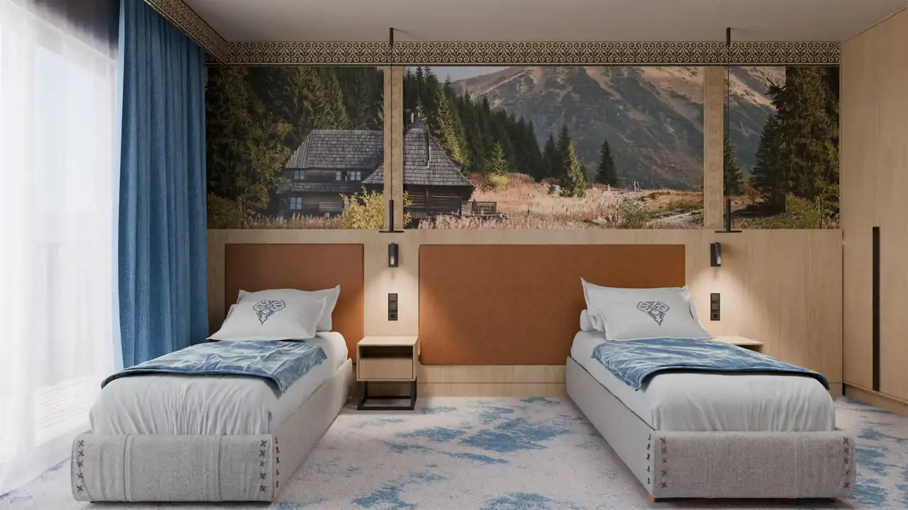 W aranżacji główną rolę odgrywają też skórzane obicia i nagłówki, a motywy góralskie w postaci ornamentów przy sufitach i łóżkach akcentują jeszcze bardziej to, co naturalne i tradycyjne. Dopełnieniem wystroju jest subtelne oświetlenie podkreślające góralski styl i kreujące nastrojowe wnętrze. Nowoczesny charakter apartamentów podkreślają minimalistyczne formy mebli, jasne barwy oraz panoramiczne dekoracje ścienne z widokami Tatr.