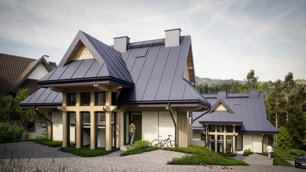 - Kameralne, zamknięte osiedle, składające się z 3 domów w klasycznym, góralskim styli ale z wyraźną nutą nowoczesnej elegancji