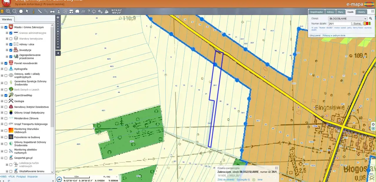 Działka położona ok 500 m od centrum Błogosławia - przez wieś przechodzi droga z Zakroczymia do Śniadowa.