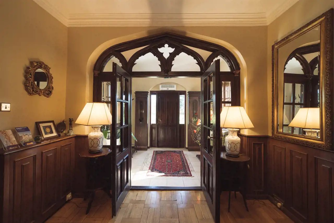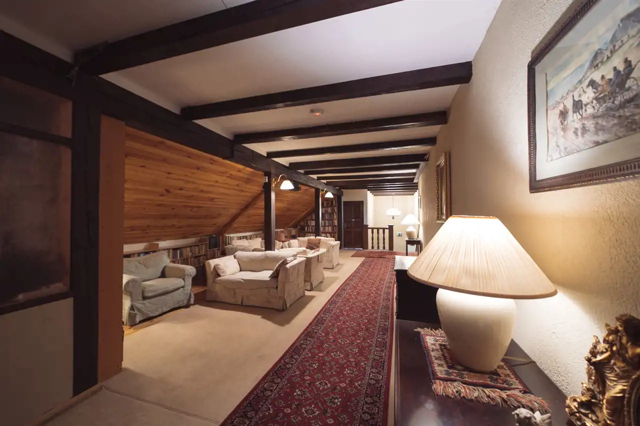 reprezentacyjny hol z klatką schodową prowadzącą na poddasze i do kondygnacji podziemnej, którą stanowi część SPA,