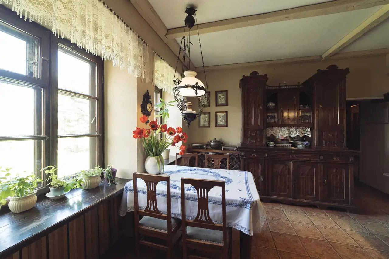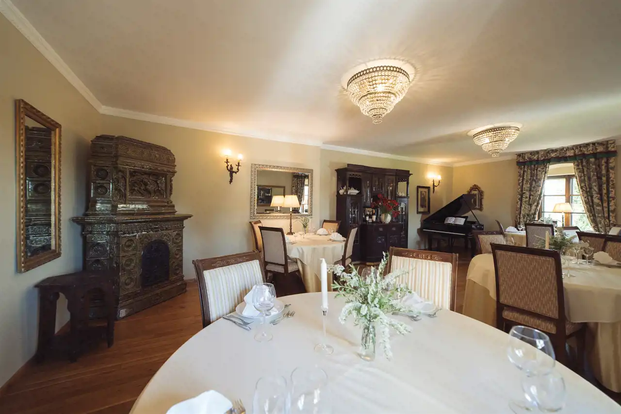sala restauracyjna z zielonym piecem kaflowym – 52 m²,