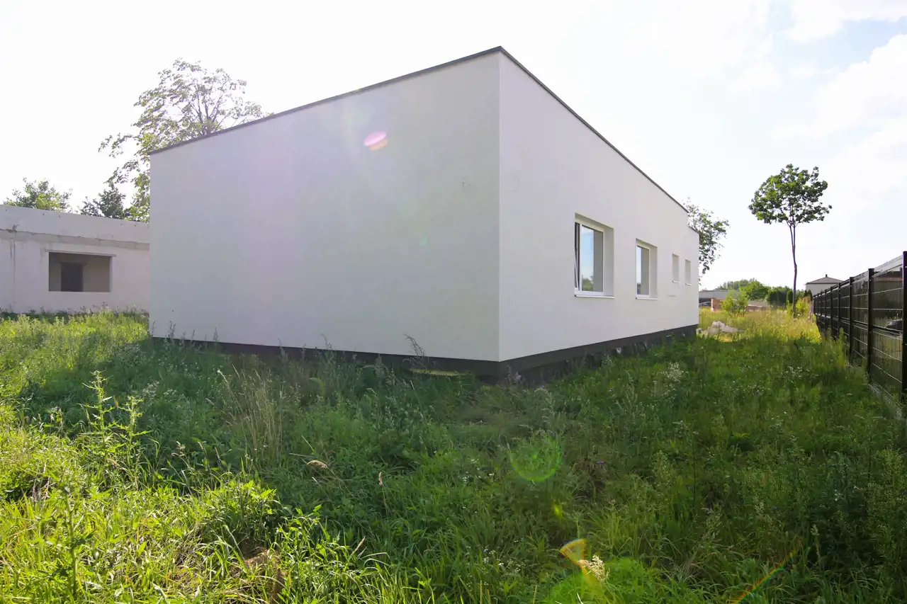 Powierzchnia domu: nowoczesna parterowa bryła z płaskim dachem i dużymi przeszkleniami.