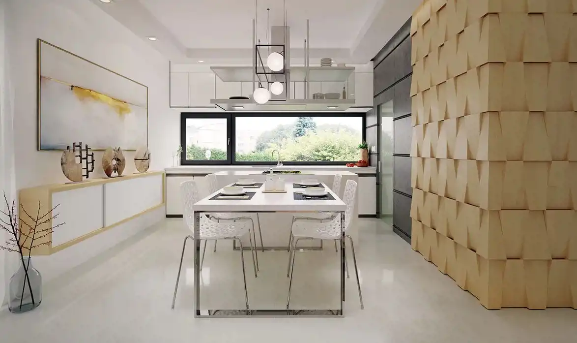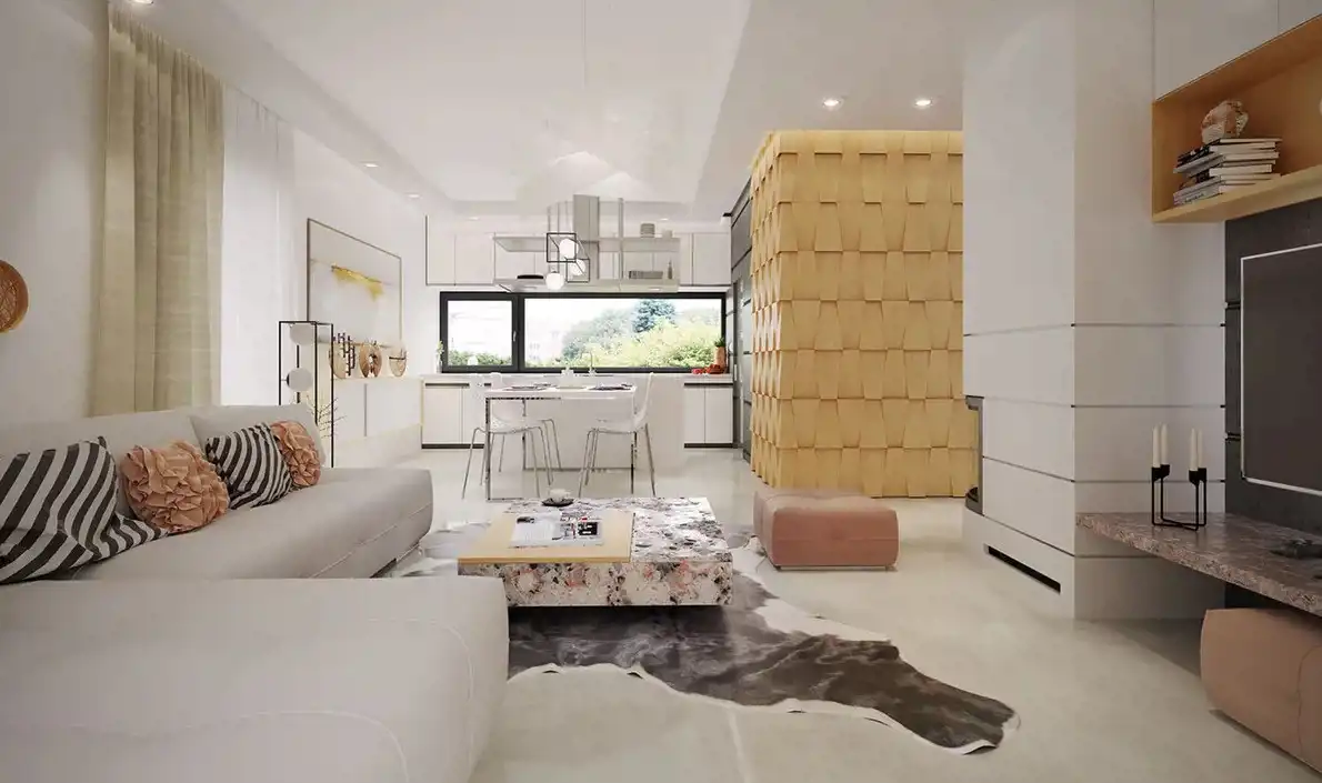 przestronny salon z otwartą kuchnią (ze spiżarnią) i wyjściem na taras