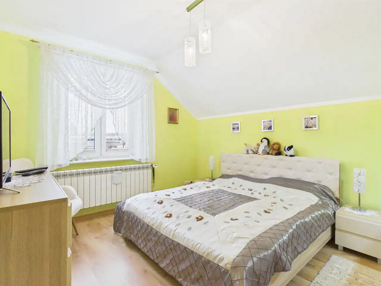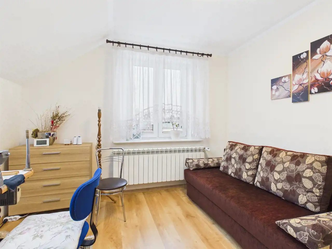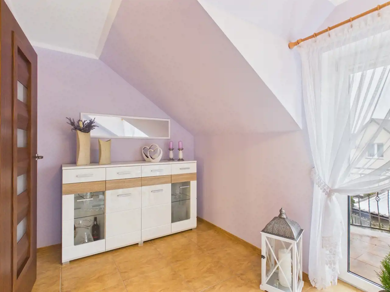 Ściany gipsowane/malowane, na podłodze panele oraz terakota. Stolarka okienna PCV