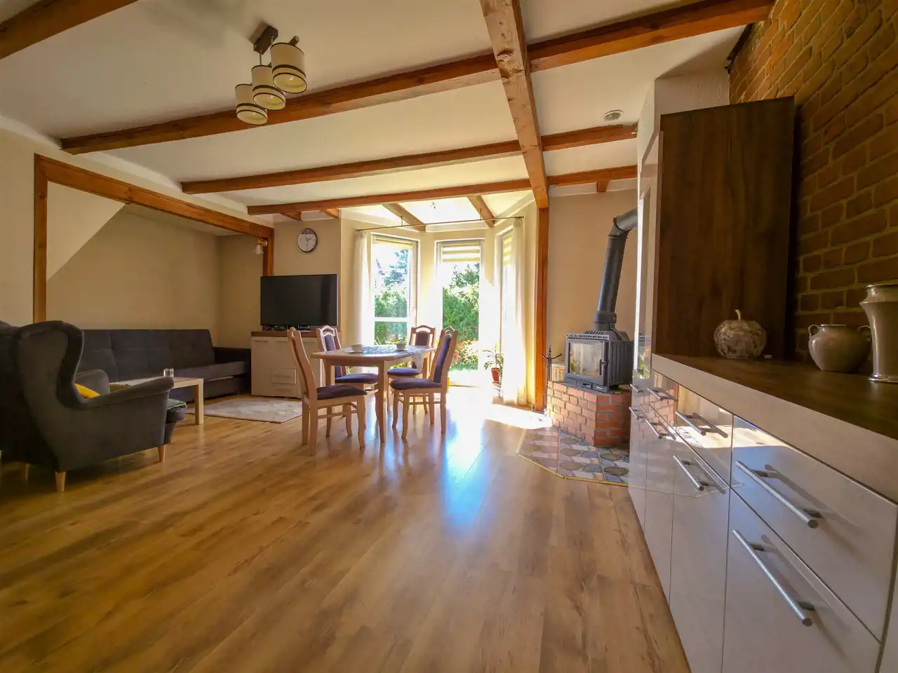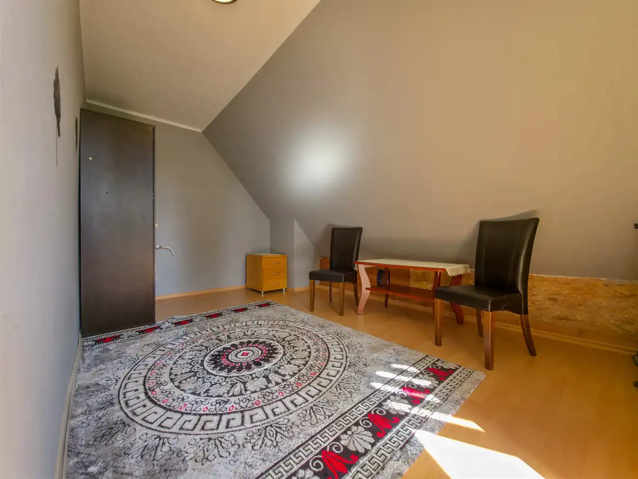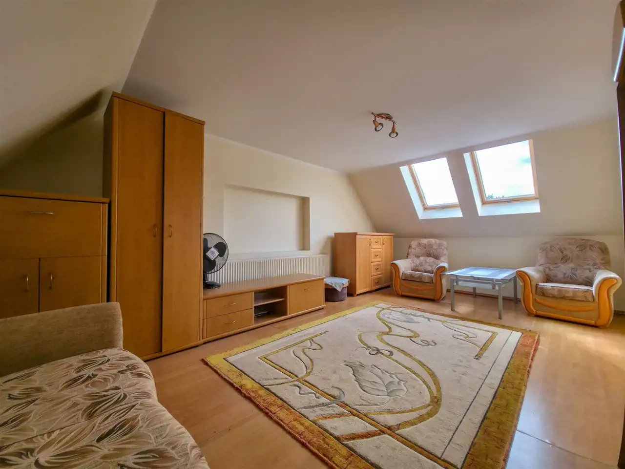 Pierwsza część: salon z aneksem kuchennym + 2 pokoje na poddaszu.