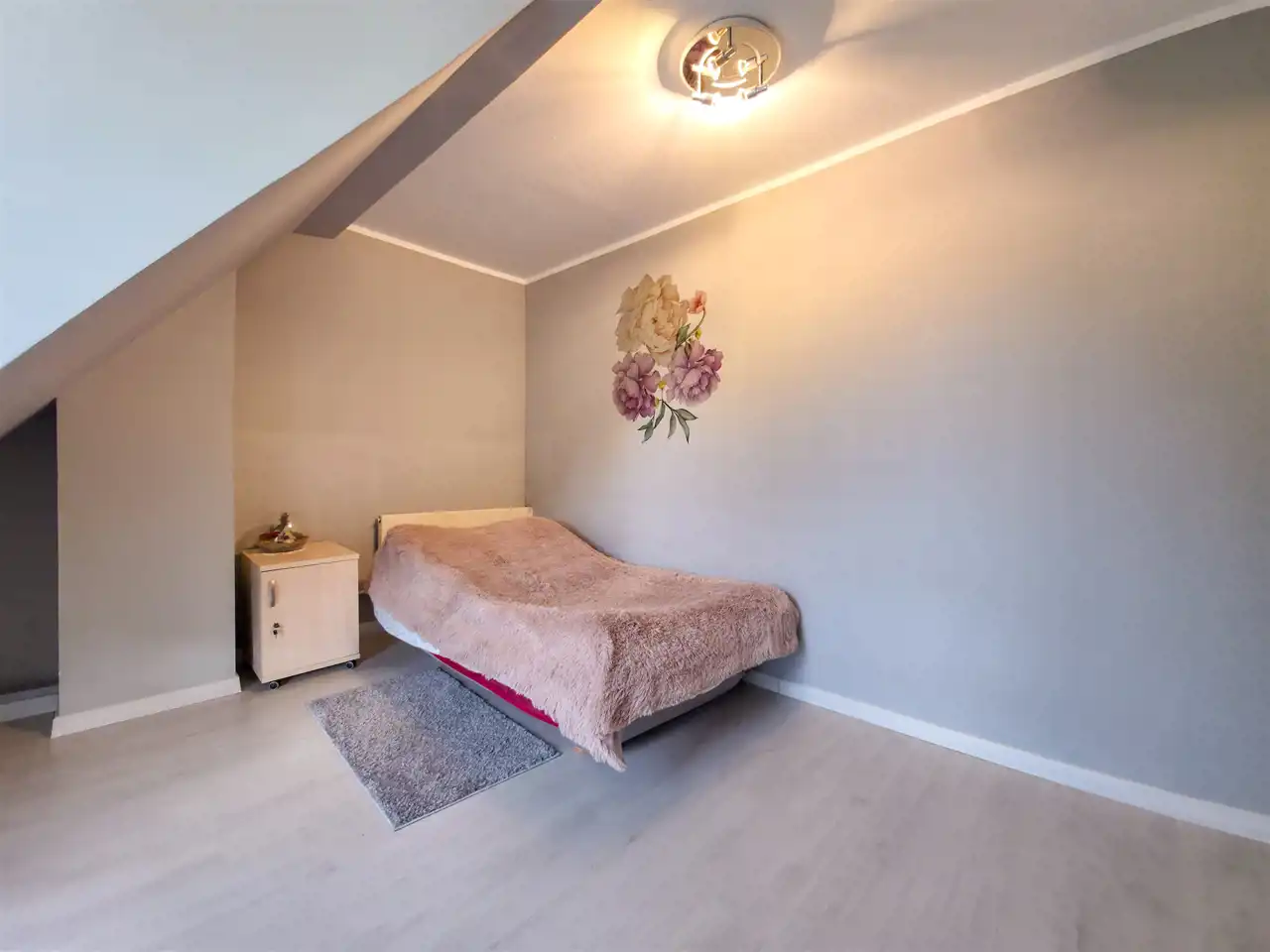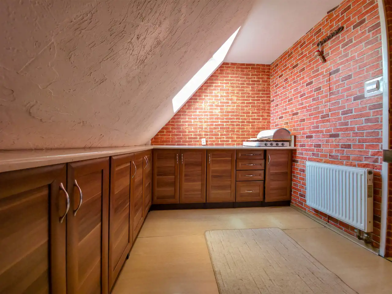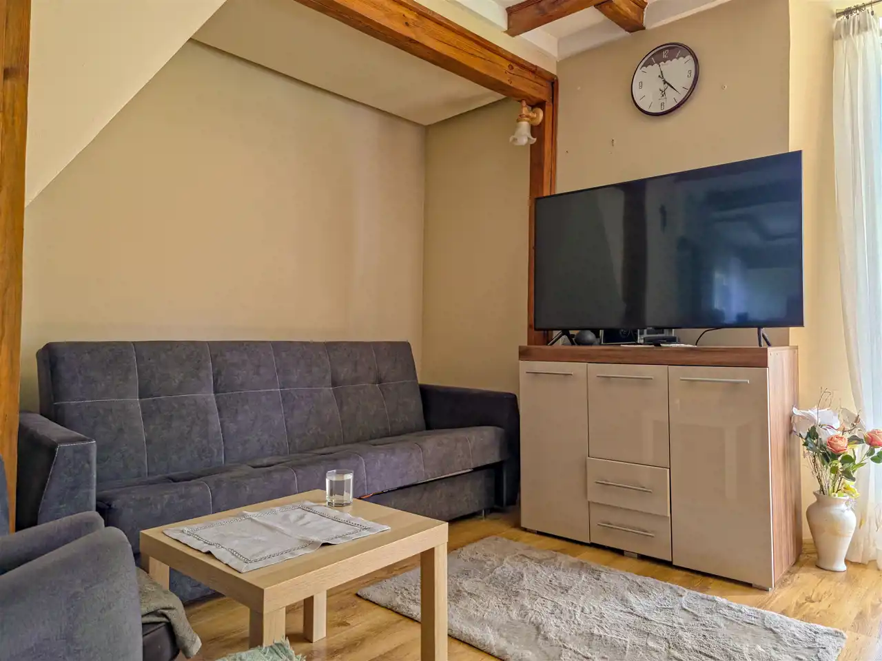 Pierwsza część: salon z aneksem kuchennym + 2 pokoje na poddaszu.