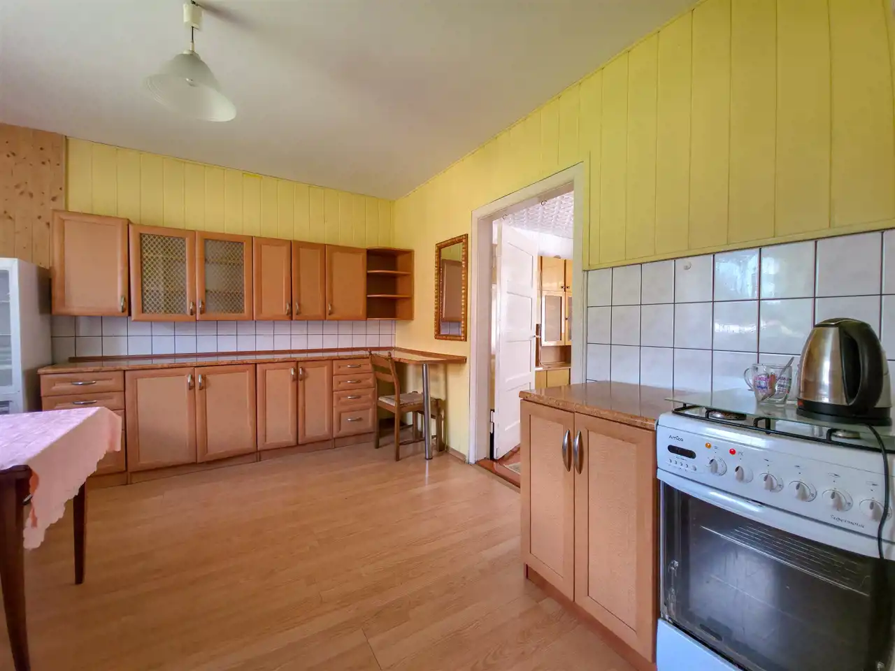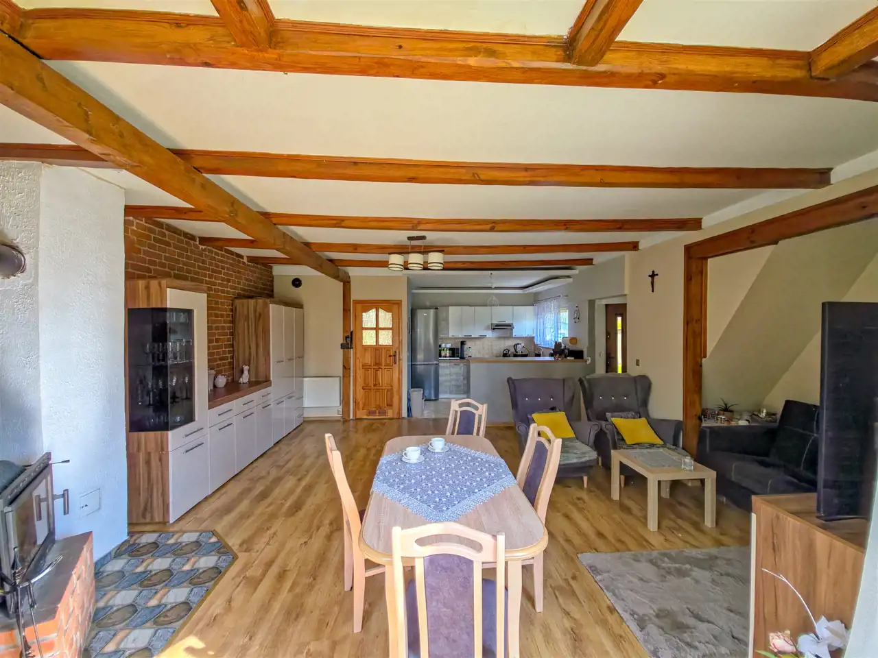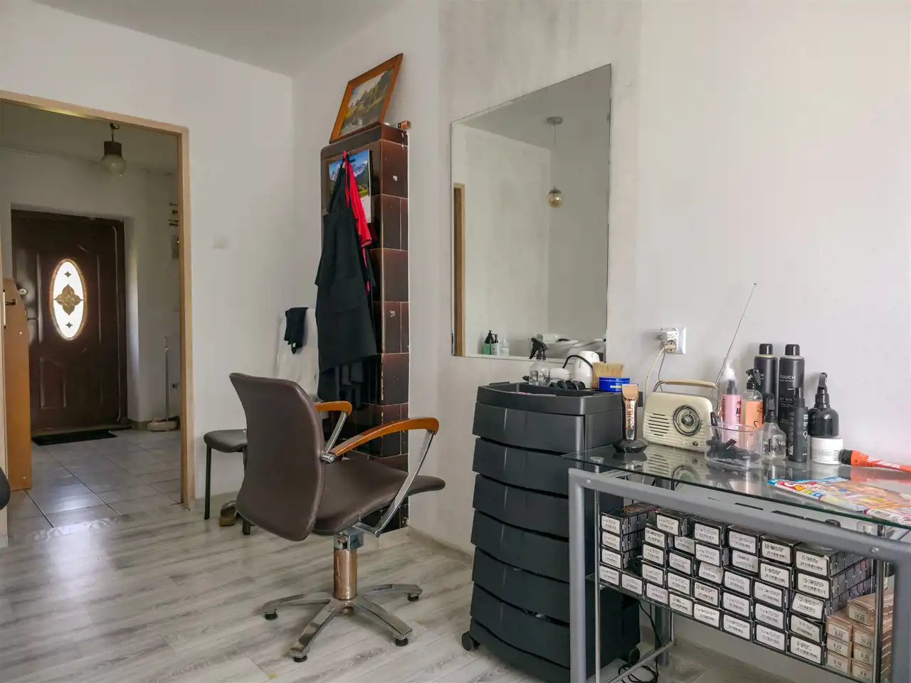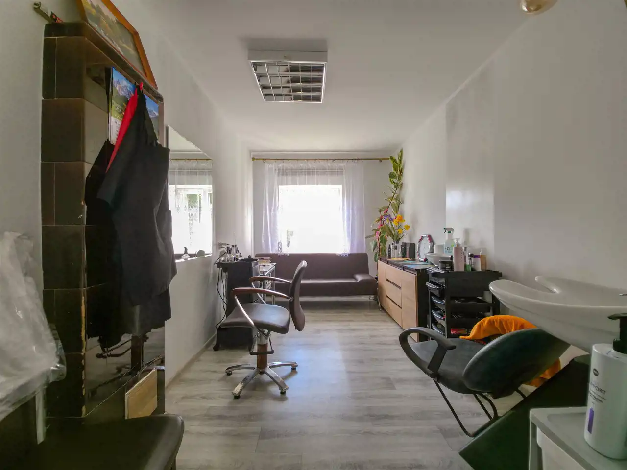 Druuga część: kuchnia + 2 pokoje (w tym jeden dostosowany do zakładu fryzjerskiego), a na poddaszu: pokój, kuchnia i łazienka.