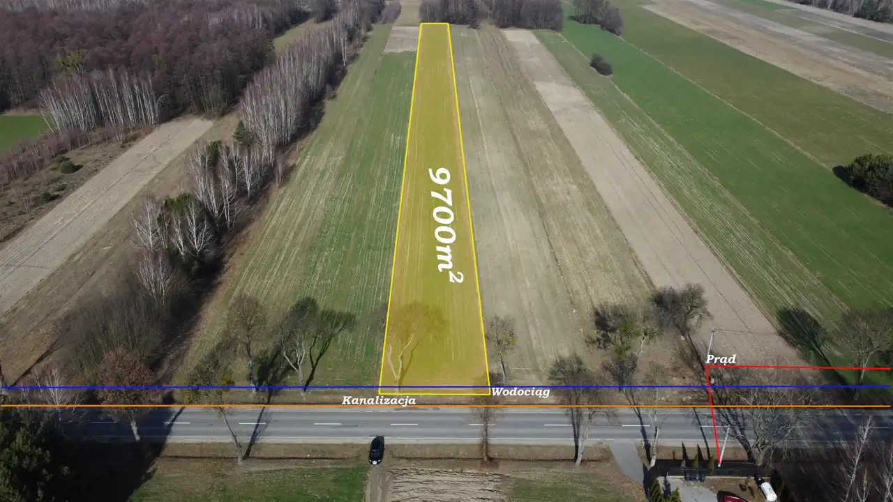 - Media Woda: w drodze; Kanalizacja: w ulicy; Prąd: w ulicy; Gaz: brak