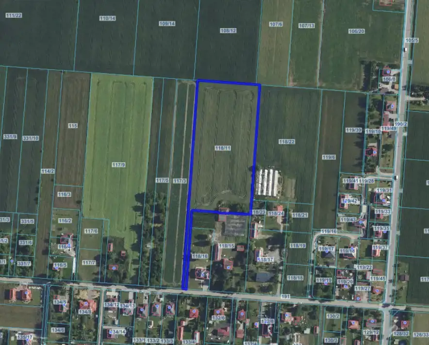 Prostokąt o wymiarach 84 x 185m wraz z gruntową drogą dojazdową szerokości 5m (do utwardzenia).