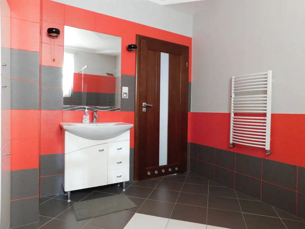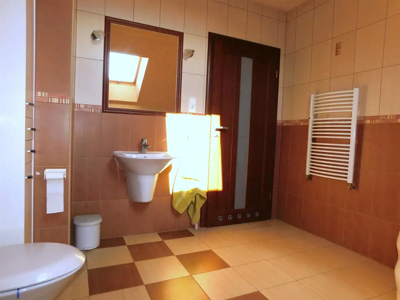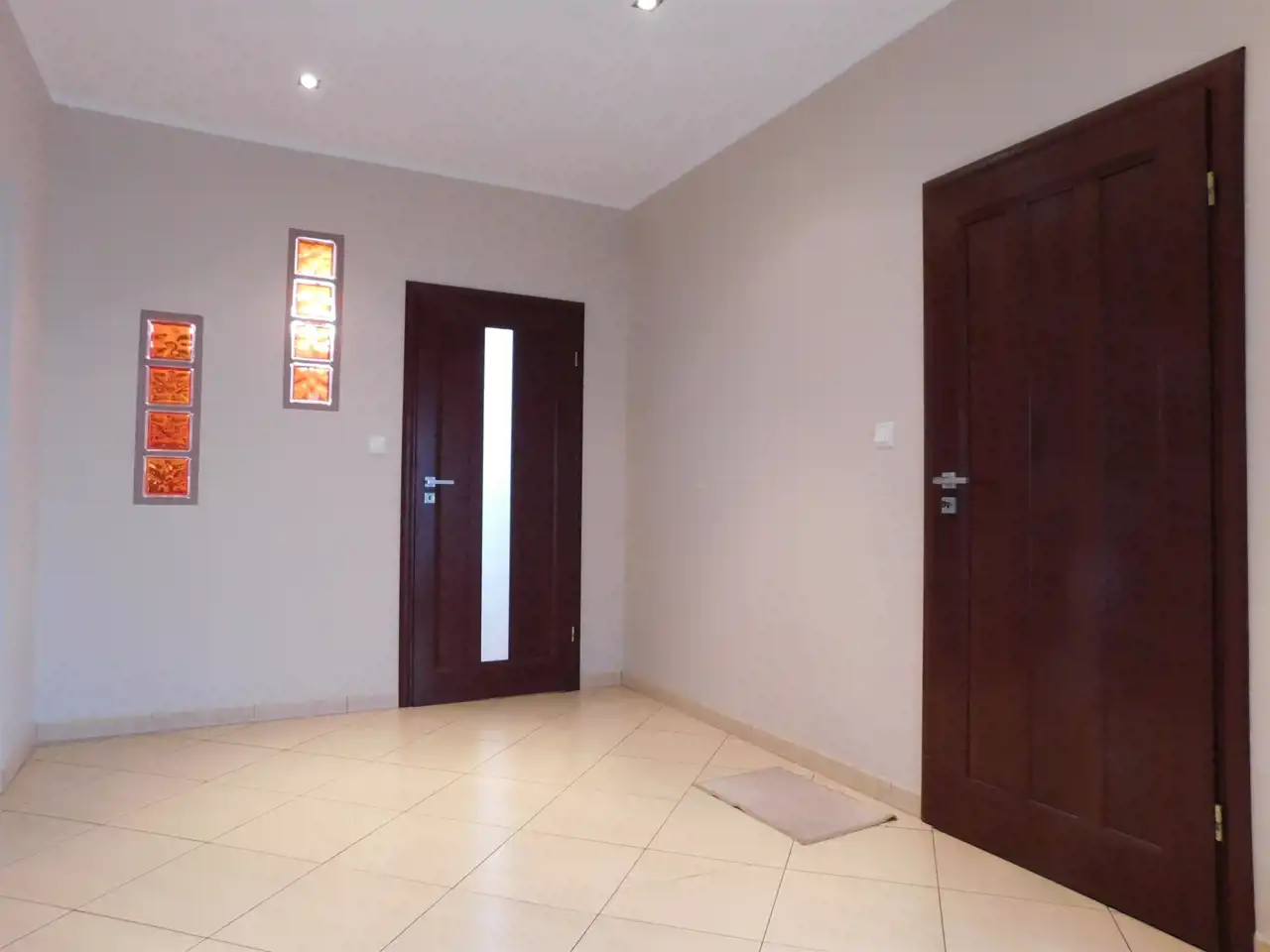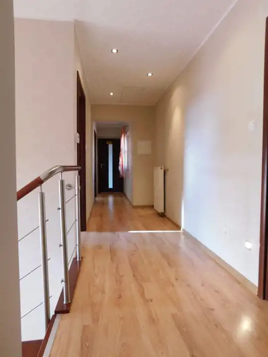 Standard: okna PVC, drzwi w całym domu zakupione u producenta z górnej półki, dachówka ceramiczna, na podłogach w pokojach jaki i korytarzu na górze panele, w salonie płytki, w łazience płytki. Ściany pomalowane w jasnych kolorach. Na piętro prowadzą wysokiej klasy drewniane schody, na parterze oraz w obydwu łazienkach ogrzewanie podłogowe, w piwnicy i na piętrze grzejniki.