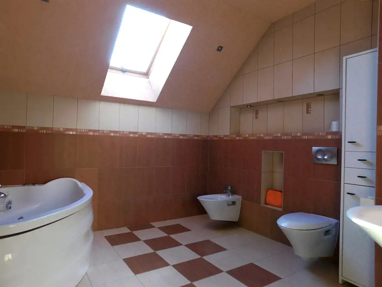 Piętro: posiada cztery sypialnie (dwie duże sypialnie (24m2 każda) usytuowane po przeciwnych stronach korytarza - idealne dla dzieci, jednej przestronnej sypialni dla rodziców (40 m2) oraz sporej sypialni gościnnej-21m2), łazienki z wanną narożną (8,6m2) oraz garderoby. Pokoje na piętrze są gotowe do umeblowania/przystosowania według własnego pomysłu.