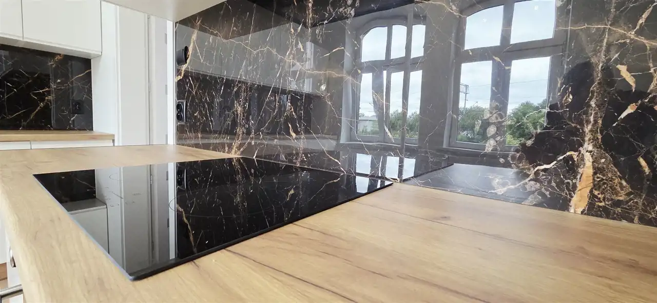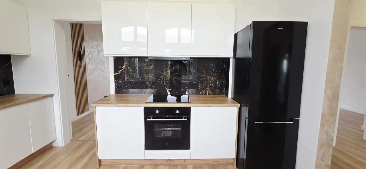 Nowoczesna kuchnia w zabudowie – wyposażona w nowy sprzęt AGD: lodówka z zamrażarką, zmywarka, okap,