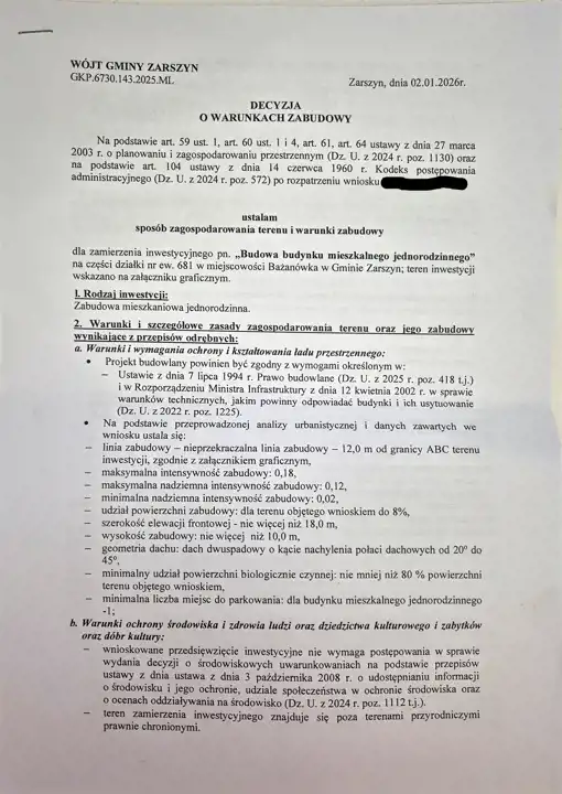 ☑️ Warunki Zabudowy wydane dn. 02.01.2026, obszar zabudowy na załączniku graficznym.