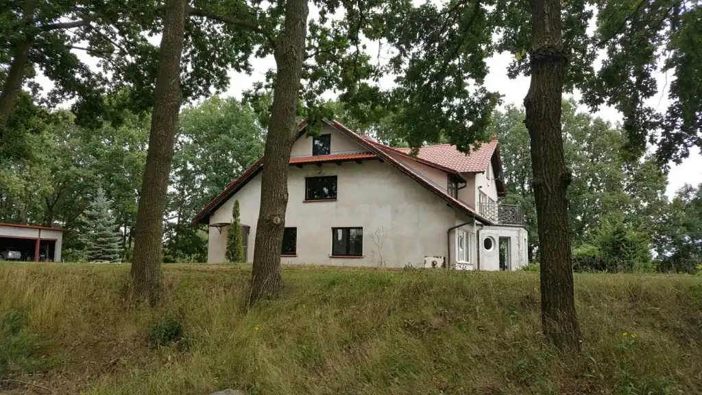 Główną bryłę budynku tworzą dwa prostopadłościany przykryte dachami dwuspadowymi o nachyleniu 40 stopni. Dom został zbudowany z dobrych jakościowo materiałów gdyż był budowany dla właściciela. Wymaga odświeżenia a łazienki remontu.