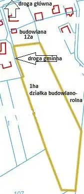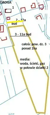 Istnieje możliwość dokupienia sąsiedniej działki w całości ok. 1 ha w tym ok. 11 arów budowlane lub w części - na rysunku nr działki oznaczony jako 3.