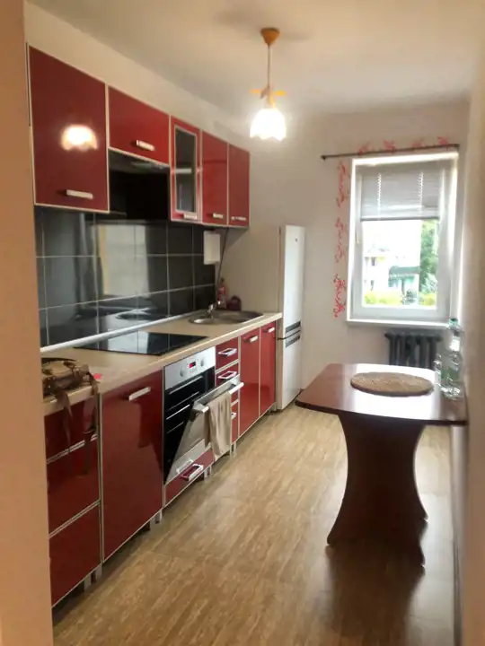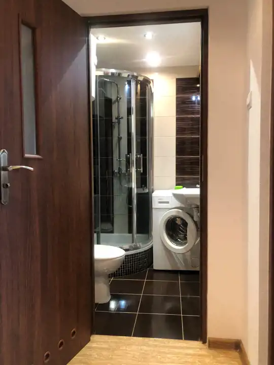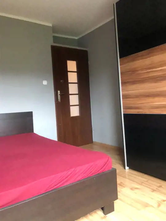 W skład mieszkania wchodzą 2 pokoje, w tym jeden wyposażony w łóżko i dużą szafę, większy z pokoi z wyjściem na balkon od strony zachodniej. Kuchnia zabudowana ze sprzętem AGD : lodówka, płyta ceramiczna, piekarnik, wyciąg kuchenny. Łazienka wyłożona kafelkami, wyposażona w kabinę prysznicową z deszczownicą, umywalkę, toaletę i bojler elektryczny (do podgrzewania wody w kuchni i łazience).