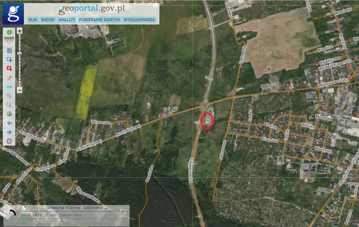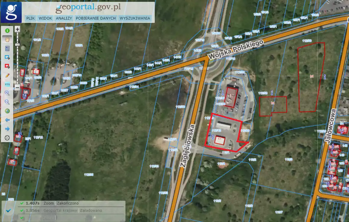 For sale: a 2,562 sqm plot with a fully operational gas station located in Zawiercie. The land has approximate dimensions of 50x49x30x15x21x52 and is developed, with access via an asphalt road.