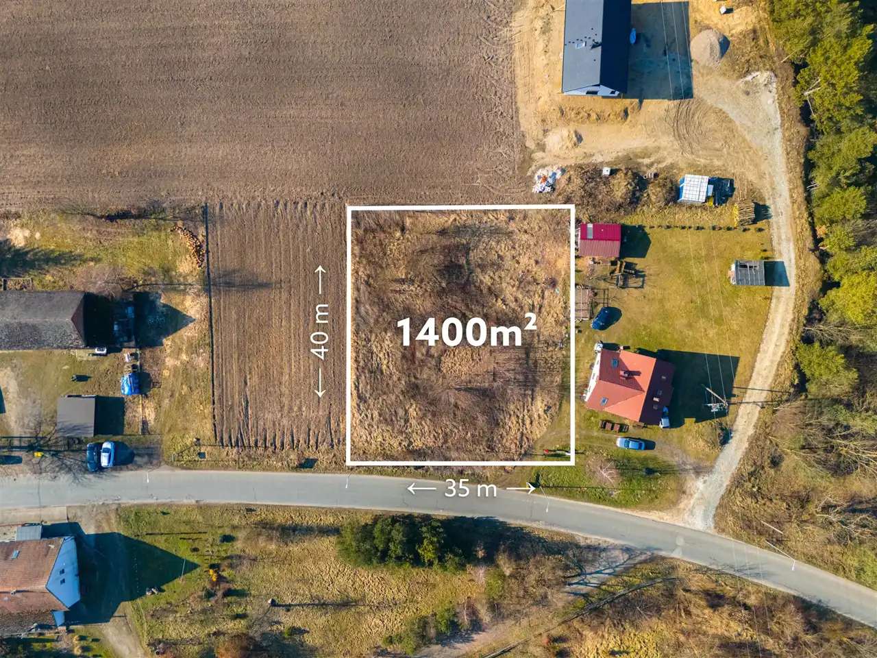 Nieruchomość o kształcie prostokąta oraz wymiarach 35 m x 40 m.