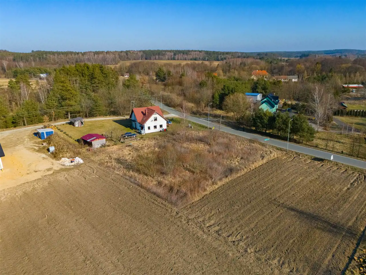 - Media Woda: jest; Kanalizacja: brak; Prąd: jest; Gaz: w drodze dojazdowej