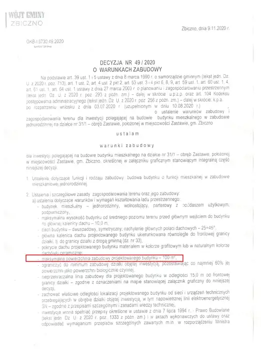 Dla nieruchomości wydano warunki zabudowy na dom jednorodzinny o powierzchni do 100 m2.