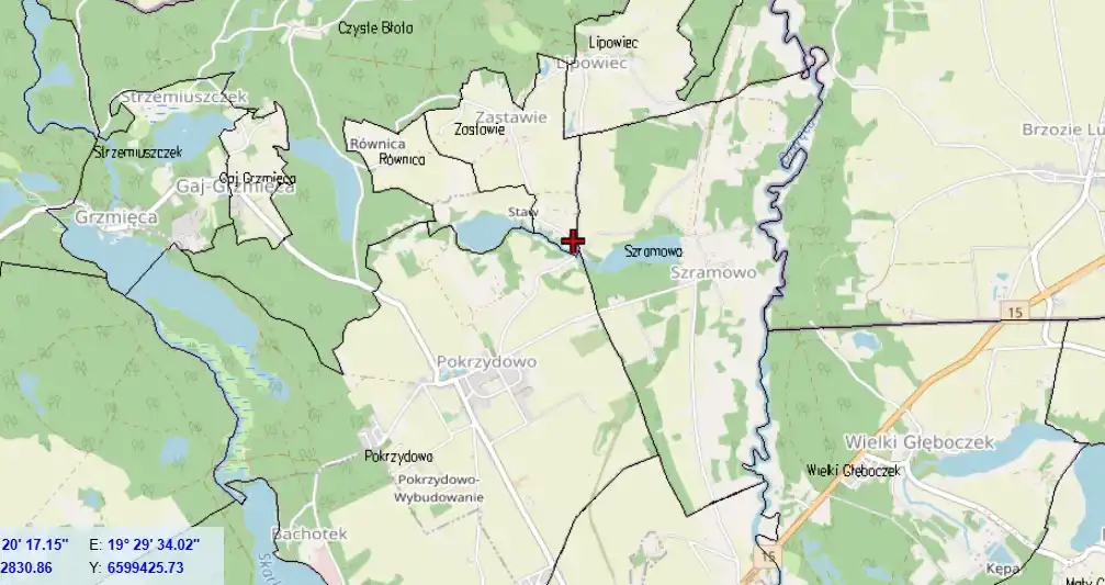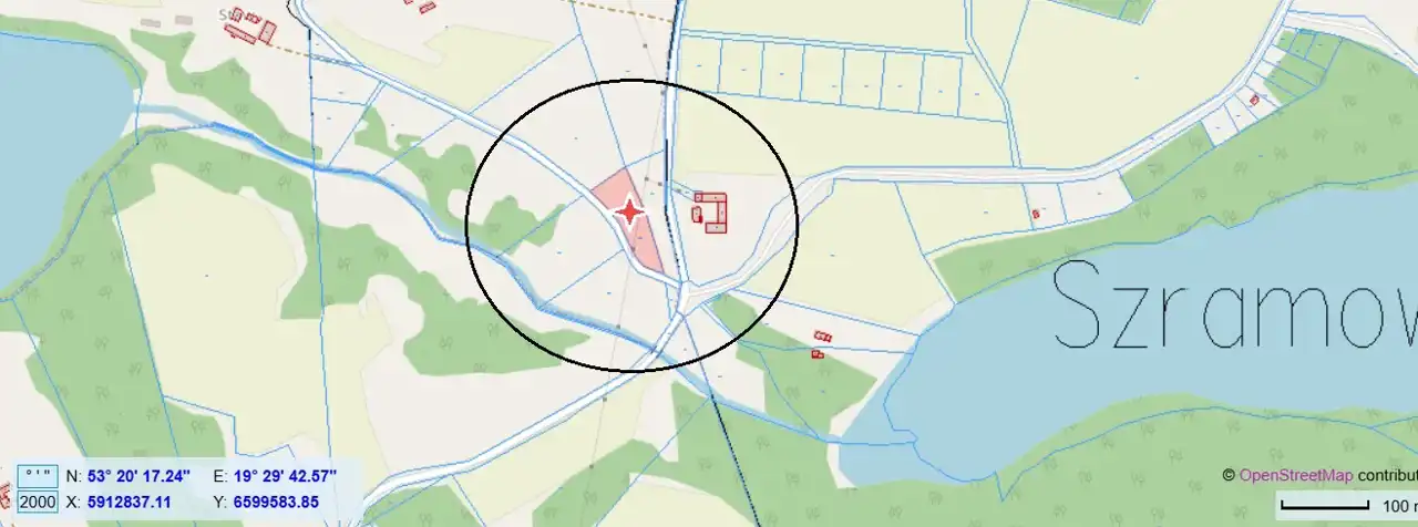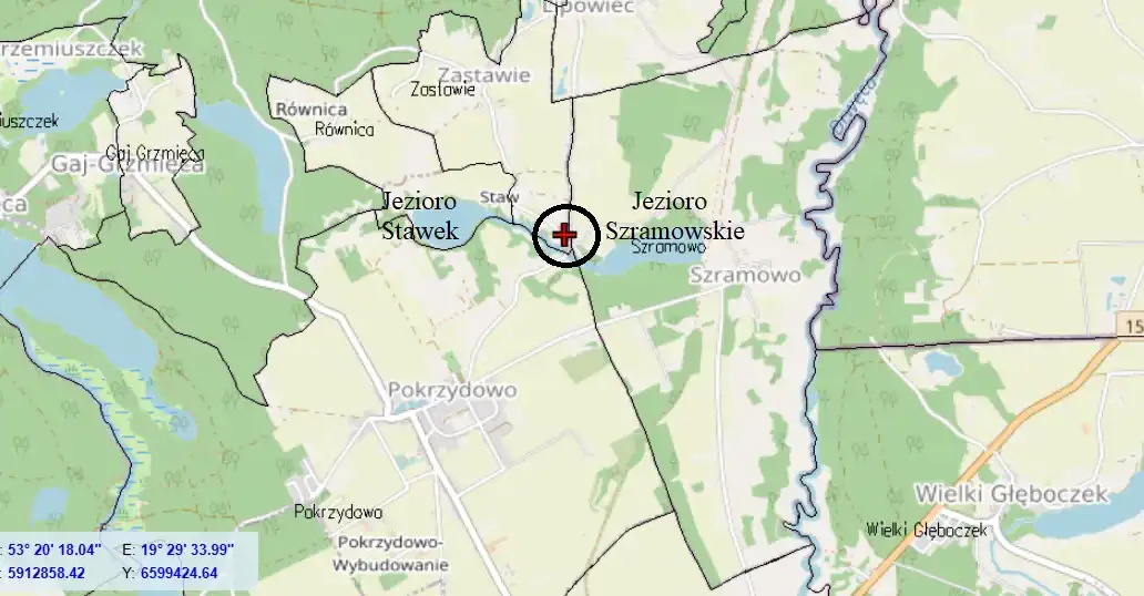 Odległość od Jeziora Szramowskiego wynosi w prostej linii ok 280 m a od Jeziora Stawek ok 500 m.