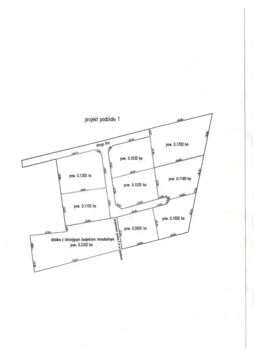 Posiadamy projekt podziału działki na 3 o powierzchniach ok: 1035 m2, 1035 m2 i 1700 m2