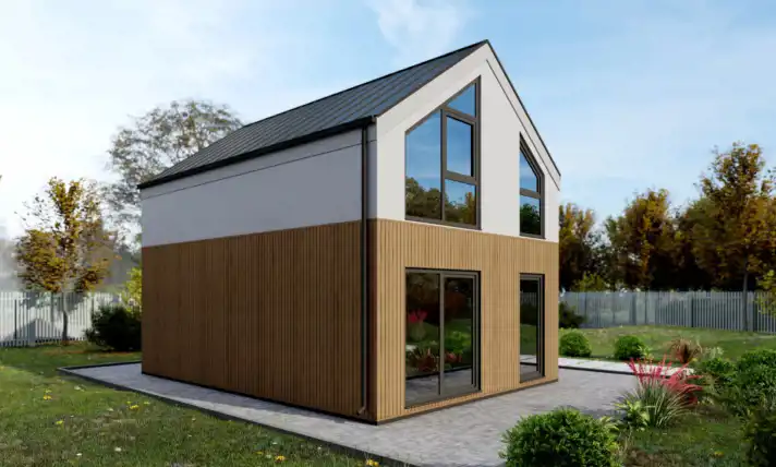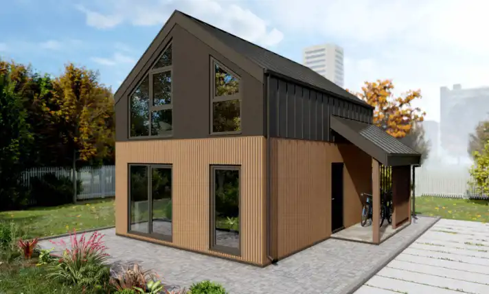 Dom wyróżnia się nie tylko funkcjonalnością, ale także estetyką, z nowoczesną bryłą i prostymi liniami, które nadają mu elegancki wygląd. To idealny wybór dla osób szukających małego, ale dobrze zorganizowanego domu, który łączy w sobie nowoczesny design z wygodą codziennego życia.