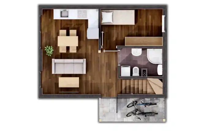 Główna część dzienna to jasny salon połączony z otwartą kuchnią, tworzący przestronną strefę wspólną, idealną do wspólnego spędzania czasu i rodzinnych spotkań. Przeszklone drzwi balkonowe w salonie zapewniają dostęp do ogrodu oraz naturalne światło, które wypełnia wnętrze. Dzięki przemyślanemu układowi, dom oferuje optymalne wykorzystanie powierzchni, gdzie każda sypialnia jest wystarczająco przestronna i ustawna. Łazienka została ulokowana w centralnej części domu, co zapewnia wygodny dostęp dla wszystkich mieszkańców.