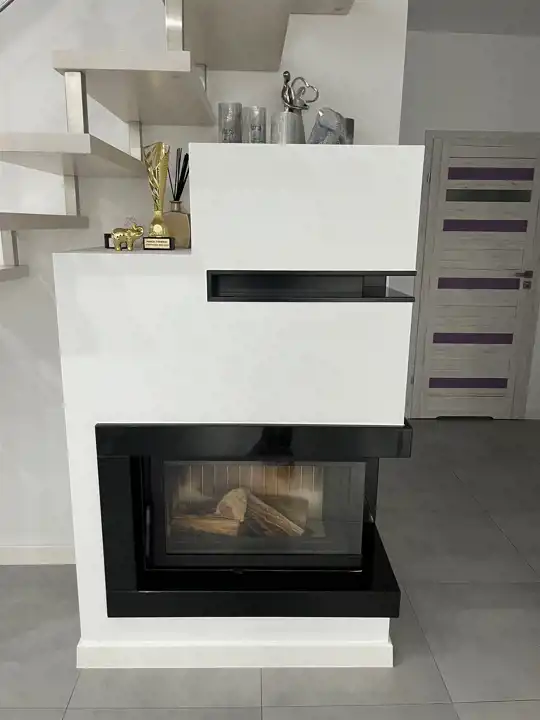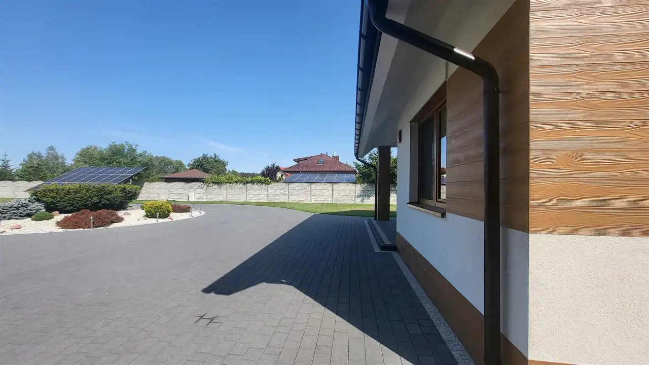 Ogrzewany pompą ciepła z odwiertami i fotowoltaiką, dodatkowo kominek. Budowany w 2017r.