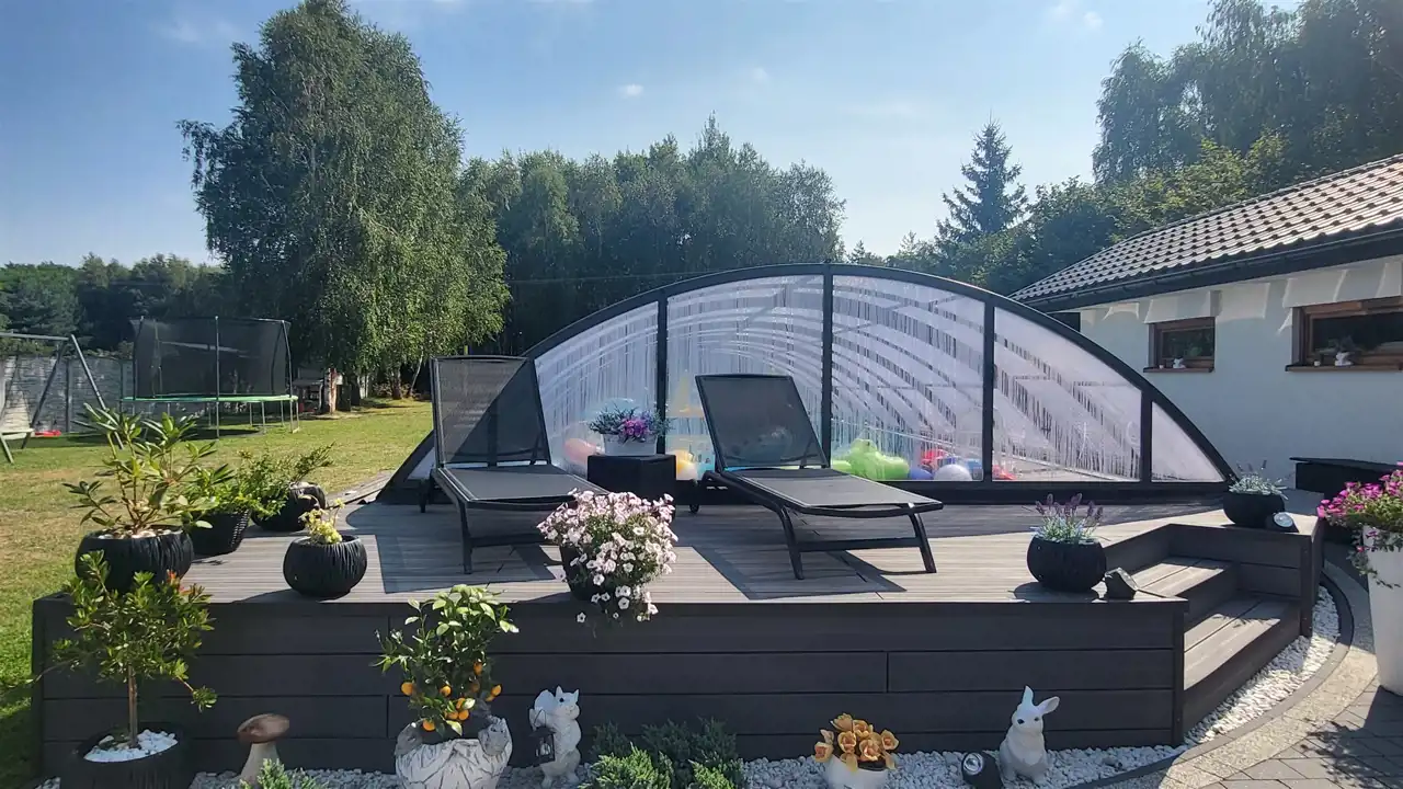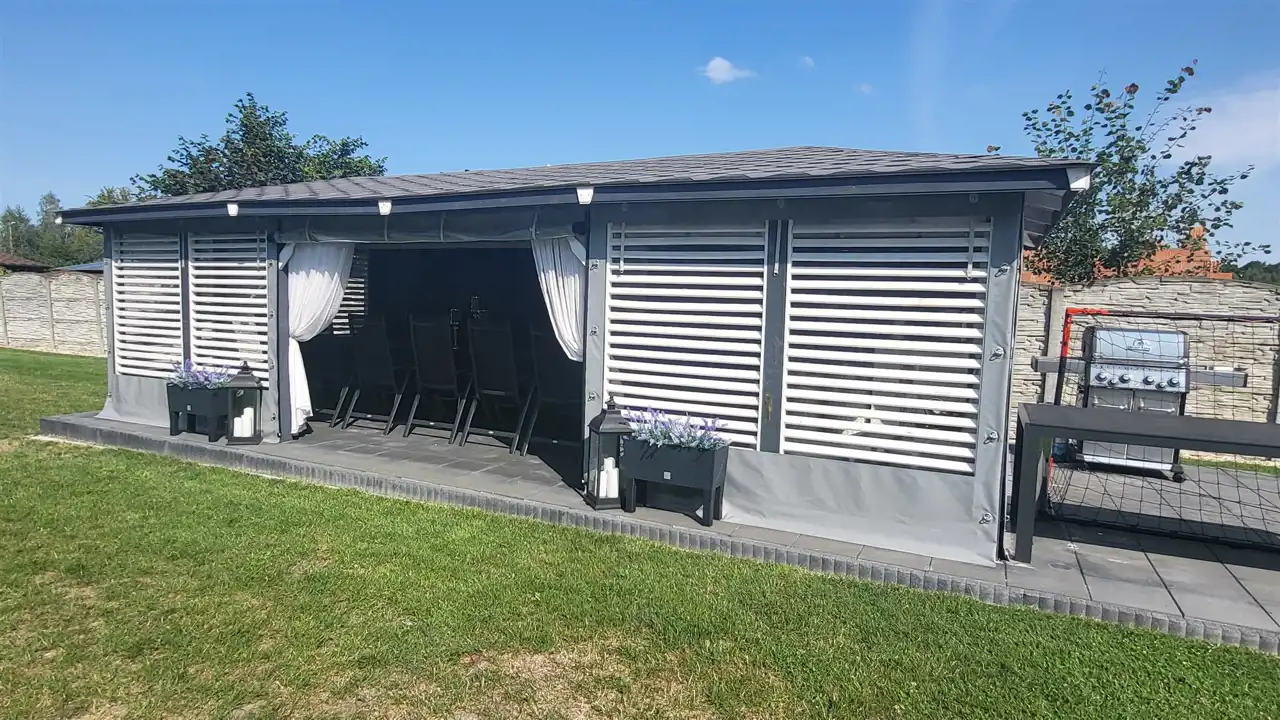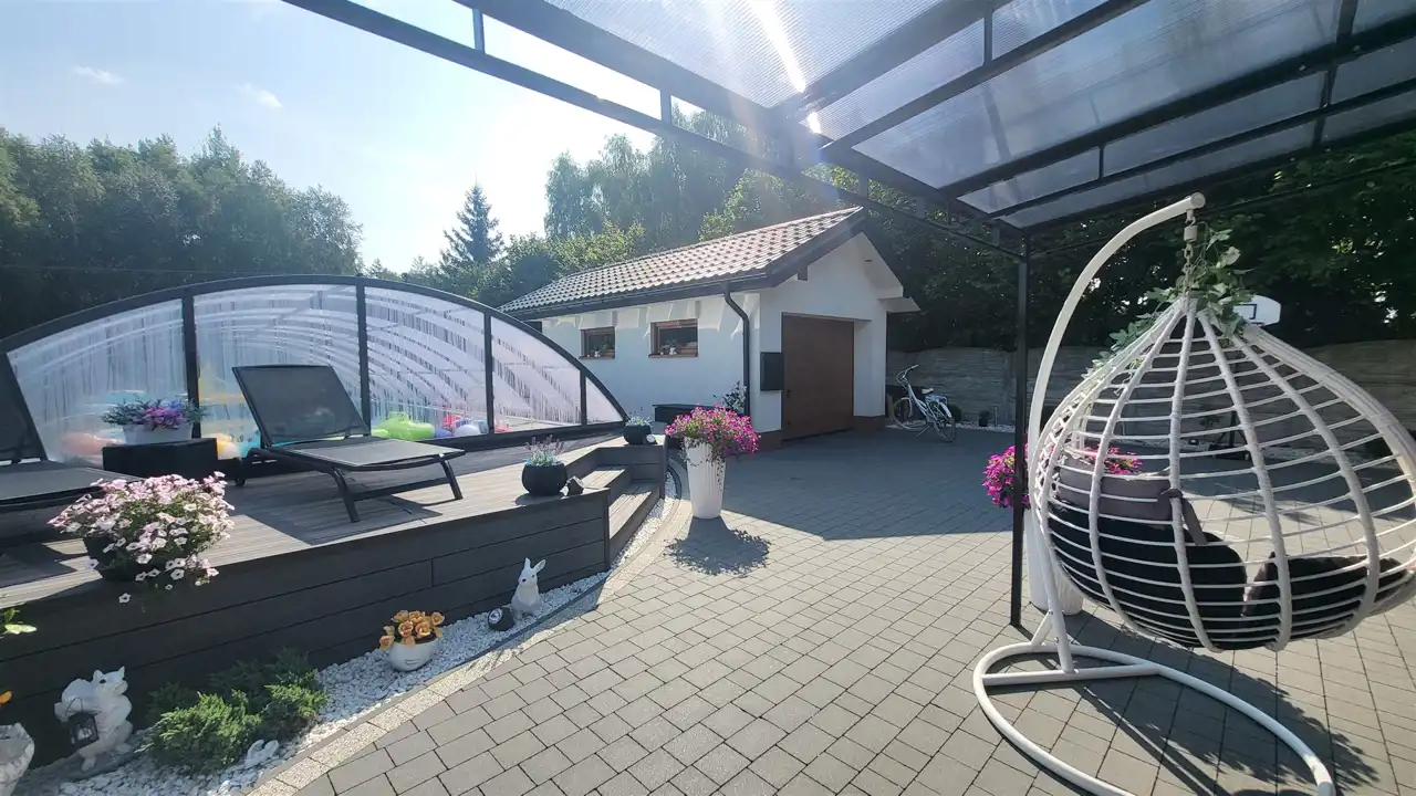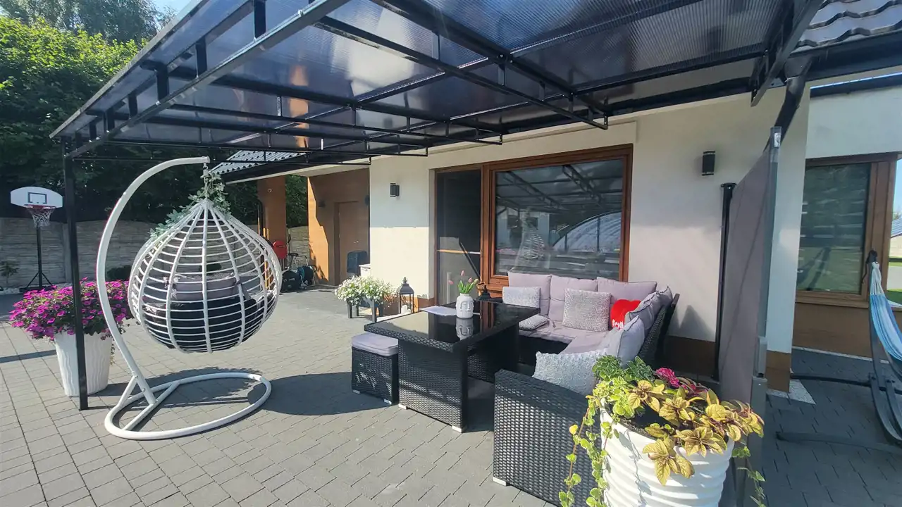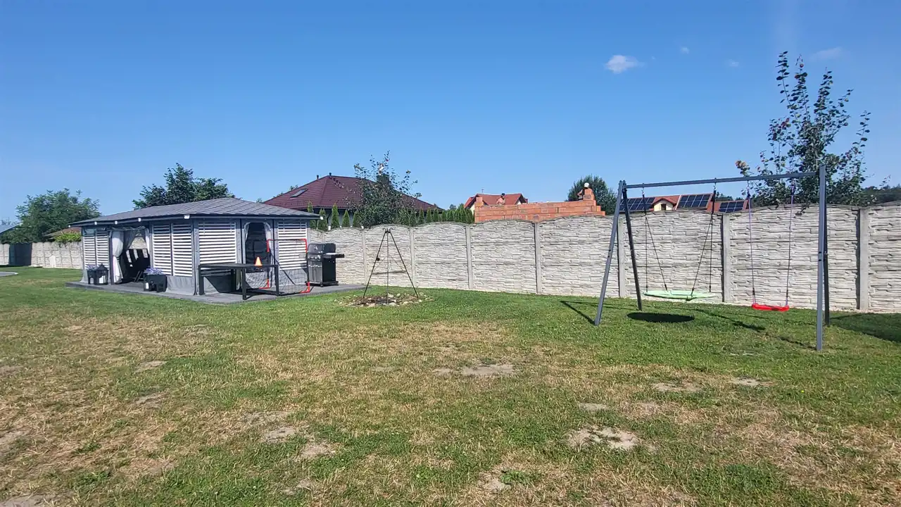 Za domem znajduje się część rekreacyjna, taras, basen o wymiarach (9,5x4,5x1,20) i głębokości 110 z filtrem szklanym, altana o powierzchni 36m2 oraz garaż 7m x 4m. Zadbany ogród z licznymi nasadzeniami, dojazd wyłożony kostką.