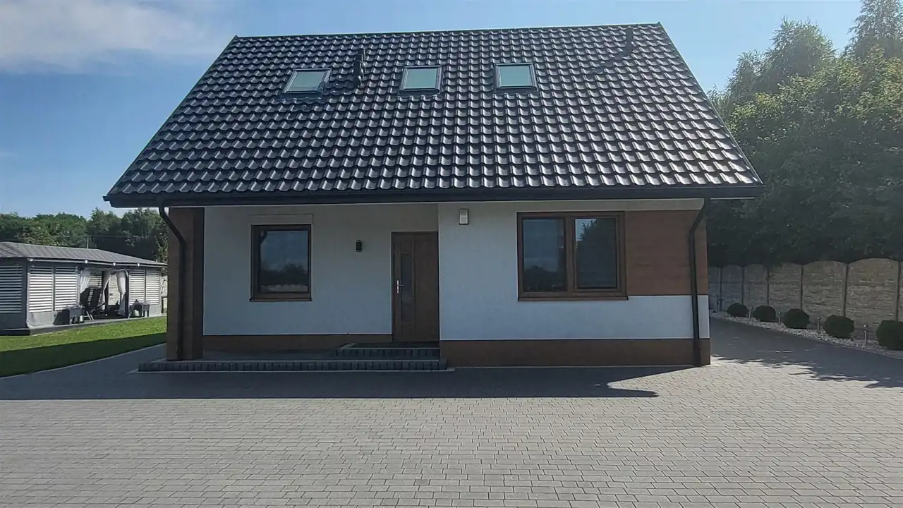 Dom parterowy z poddaszem, bez podpiwniczenia. Pokryty blachodachówką, docieplony pianą PUR.