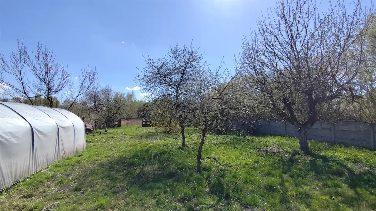Obok garażu znajduje się drewniana zabudowa, na przeciwko garaż blaszany, szklarnia oraz mała wędzarnia.