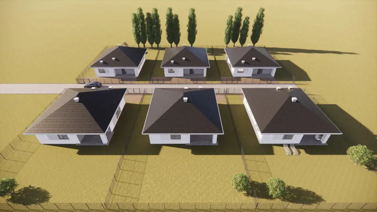 Domy parterowe murowane z silikatów H+H docieplonym 20cm styropianem z dachem czterospadowym pokrytym dachówką betonową, ogrzewanie podłogowe zasilane pompą ciepła.