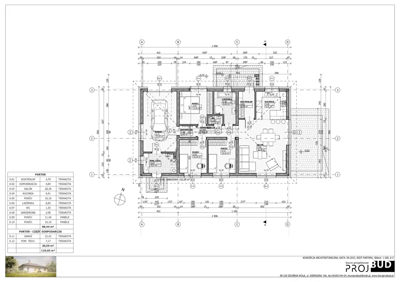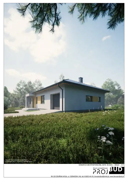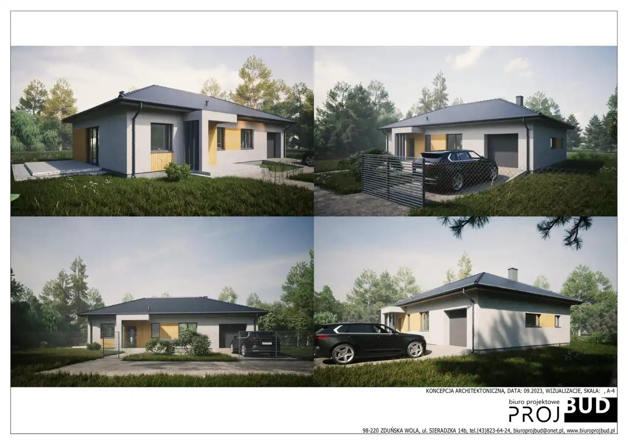 Budynek parterowy, wolno stojący z garażem w bryle o powierzchni użytkowej 119,04 m2 wybudowany według projektu indywidualnego położony na działce nr 322/14 o powierzchni 1059 m2.