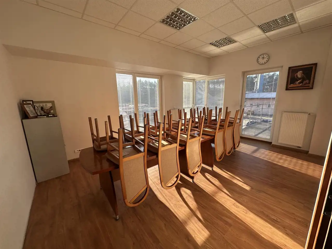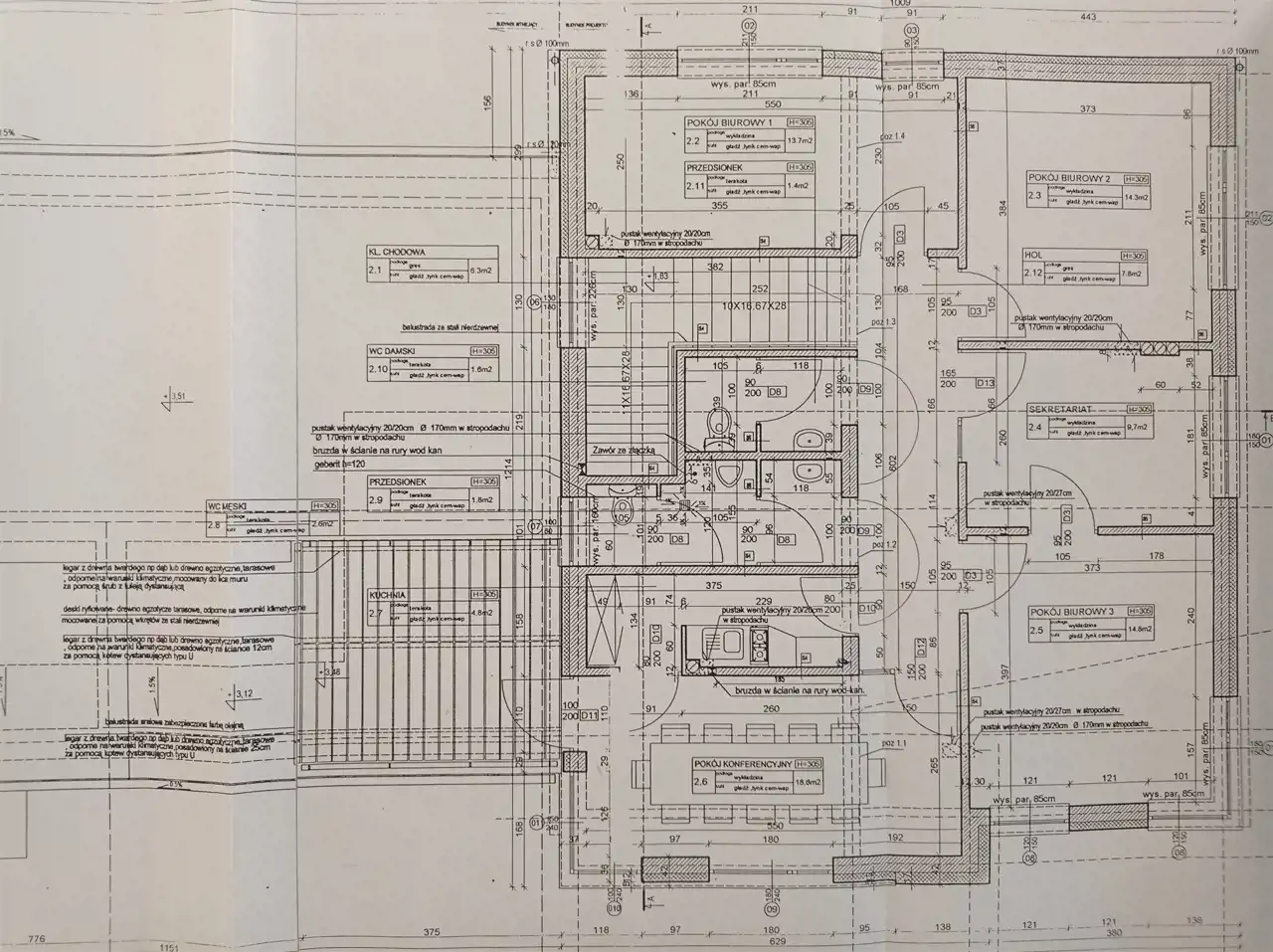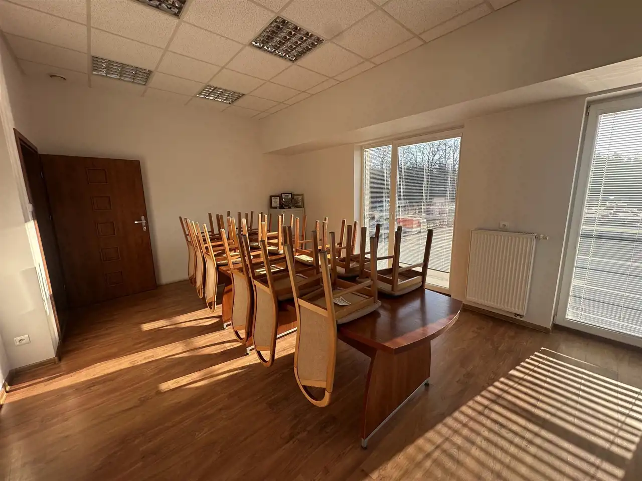 Na pierwszym piętrze otwarty aneks kuchenny, 3 biura, sala konferencyjna na ok. 30 osób z kuchnią, łazienka damska i męska,