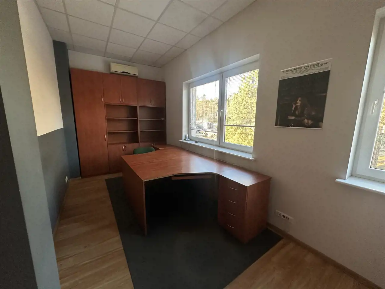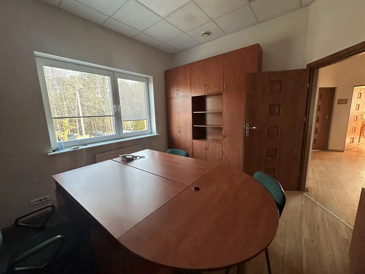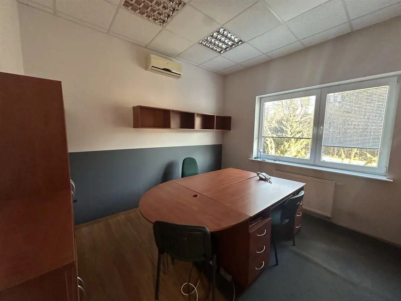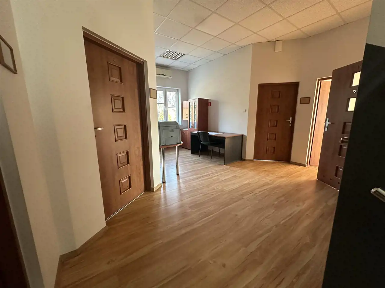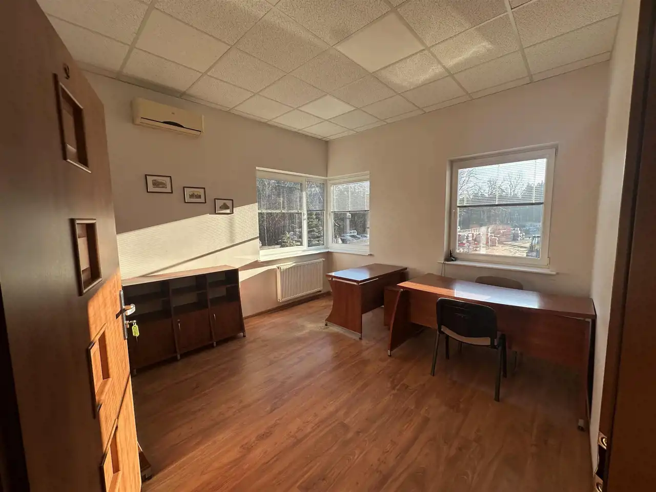 Budynek jest ocieplony, okna PCV, w pomieszczeniach na podłogach panele. Biura umeblowane, jeden gabinet z systemem alarmowym, a cały plac monitorowany.