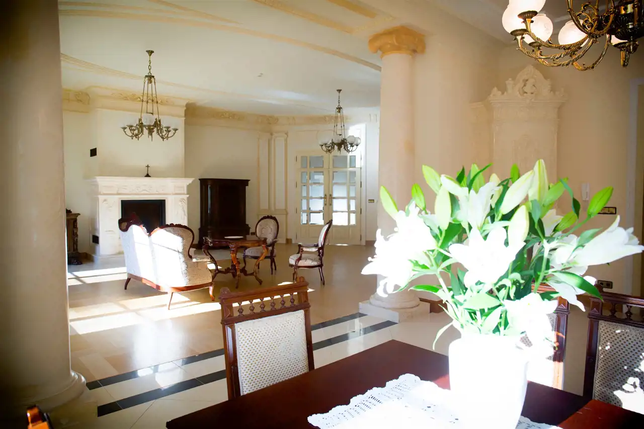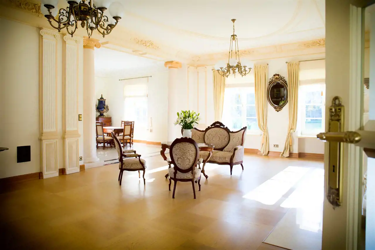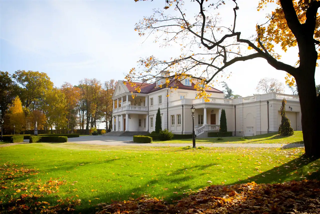 The owners have meticulously restored the interiors to reflect the mid-19th century style, complete with exceptional stucco work, lamps, chandeliers, furniture, and antiques. This creates an atmosphere that transports you back to the historical grandeur of the manor's peak era.Today, the manor can be regarded as a luxury residence adapted to modern living. The surrounding park features vast green spaces and several natural monuments. A stocked pond with a fountain is adjacent to an amateur golf course.