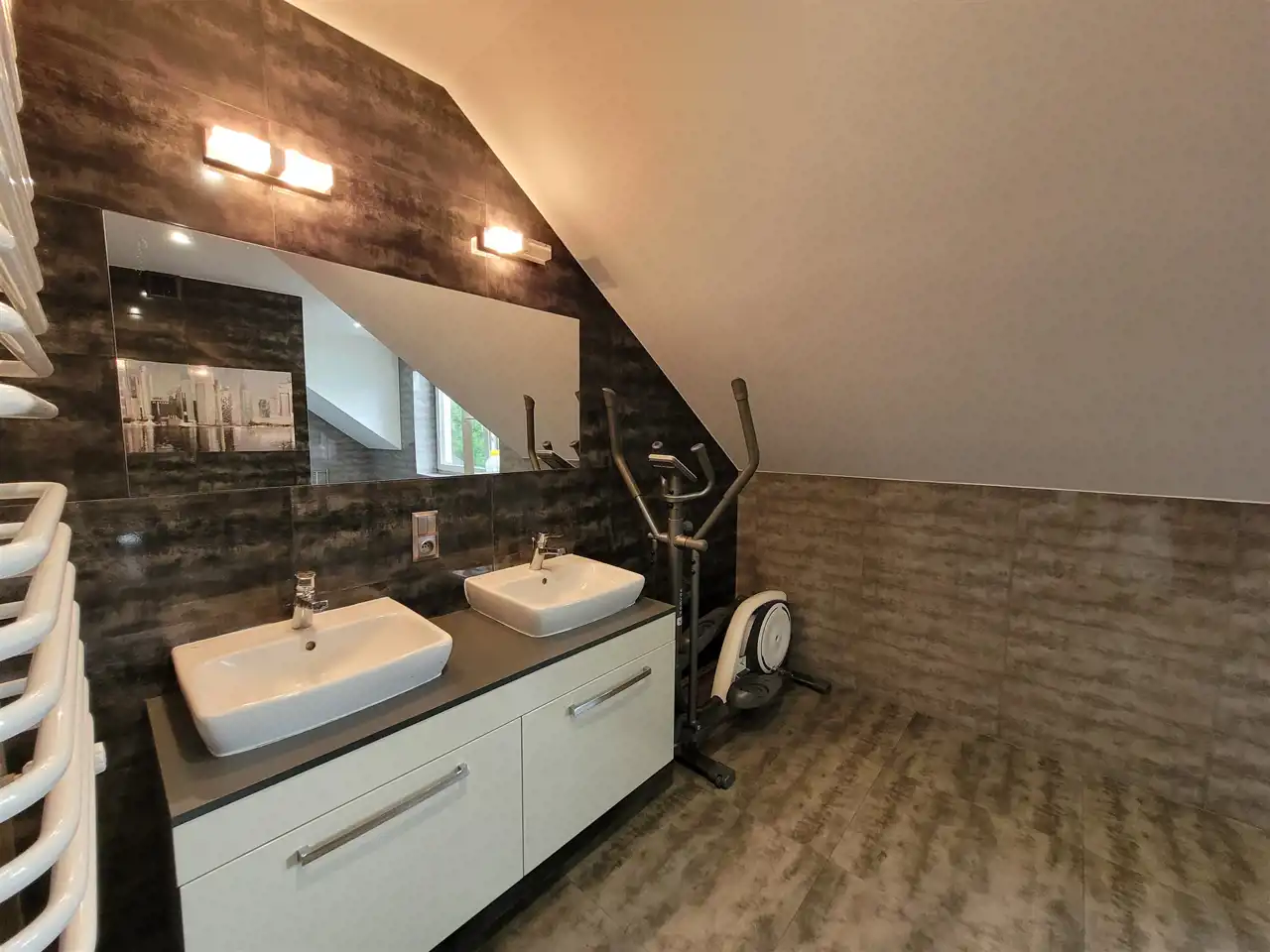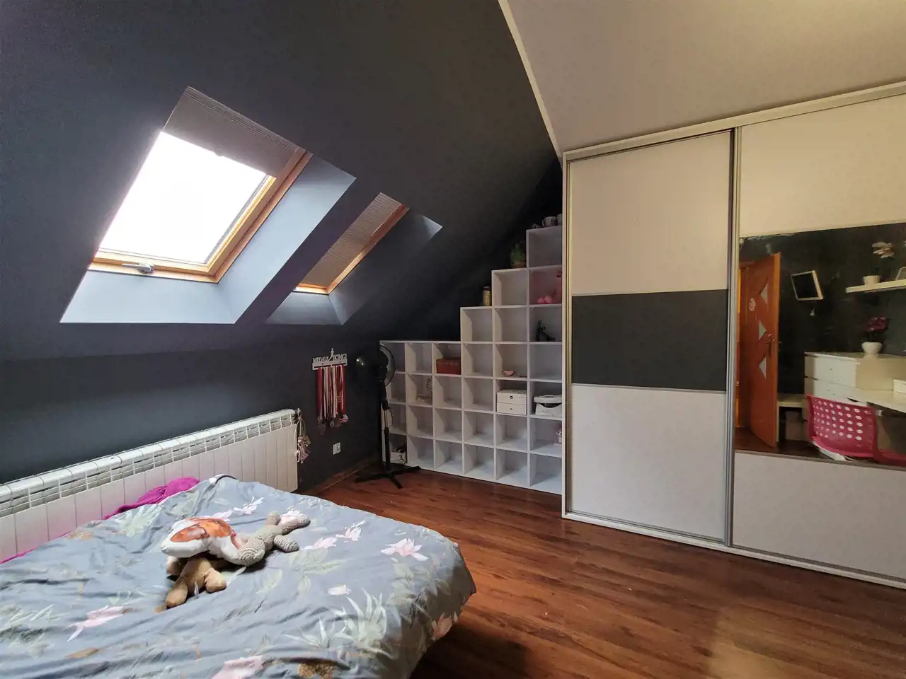 Na górnej kondygnacji urządzono strefę prywatną dla mieszkańców i znajdziemy tu trzy sypialnie- największa posiada duży balkon, korytarz z miejscem na szafę oraz bardzo przestronną łazienkę z wanną z hydromasażem i wc.