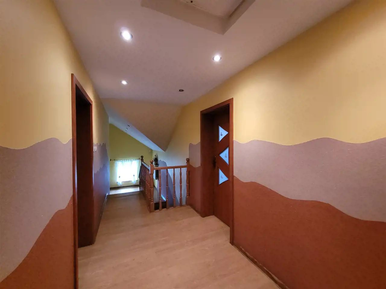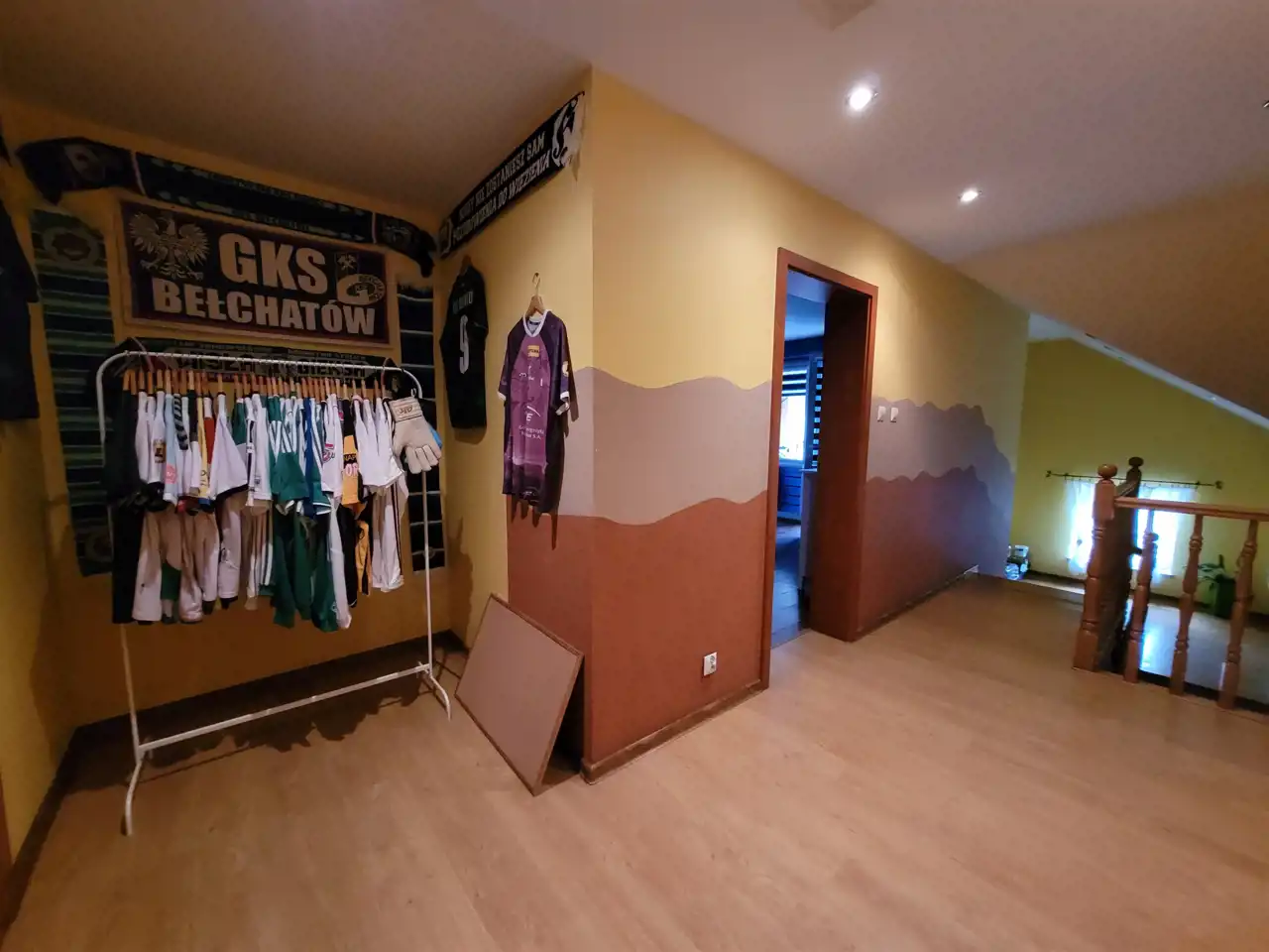 Na piętro prowadzą drewniane, wygodne schody.