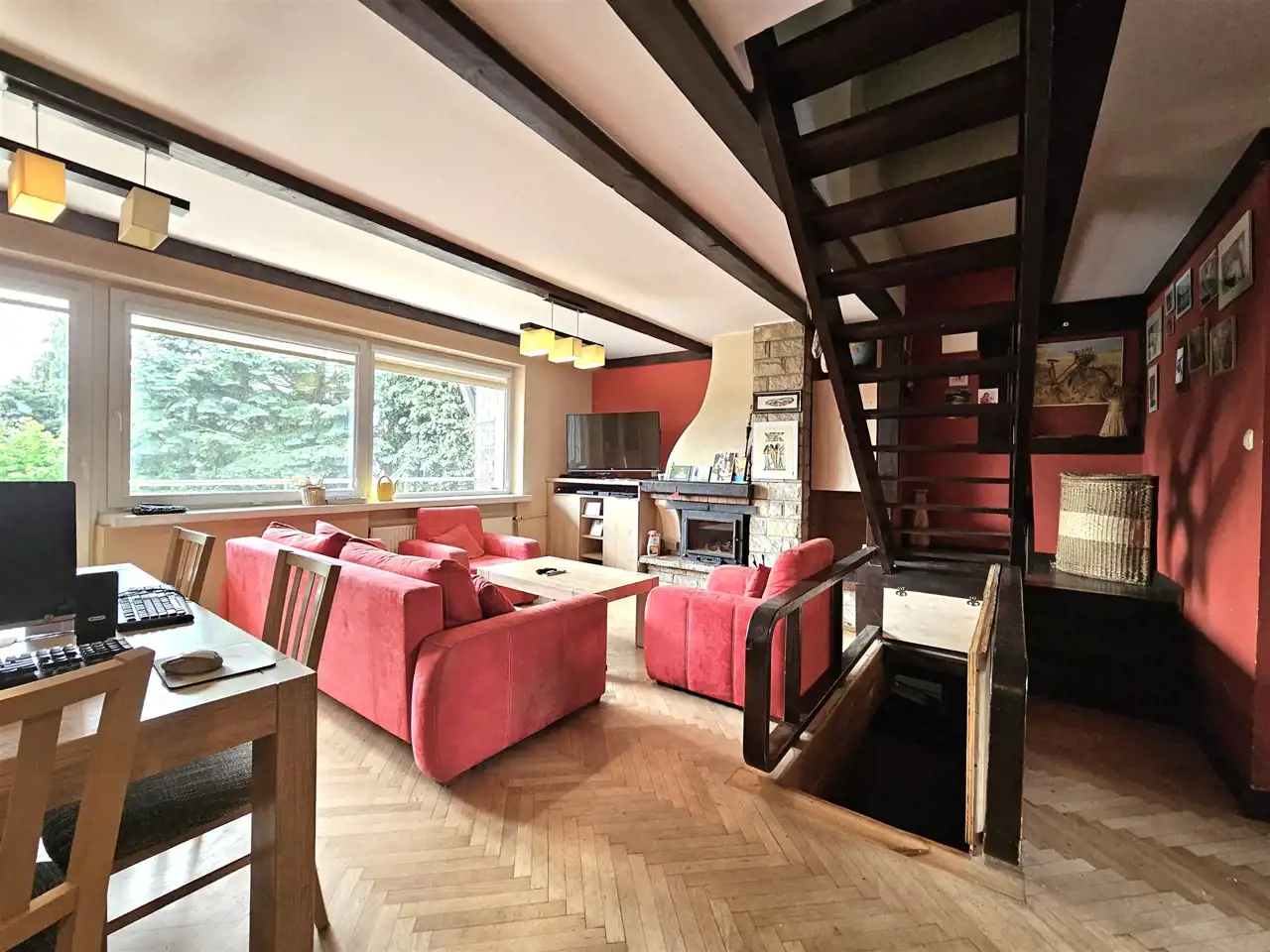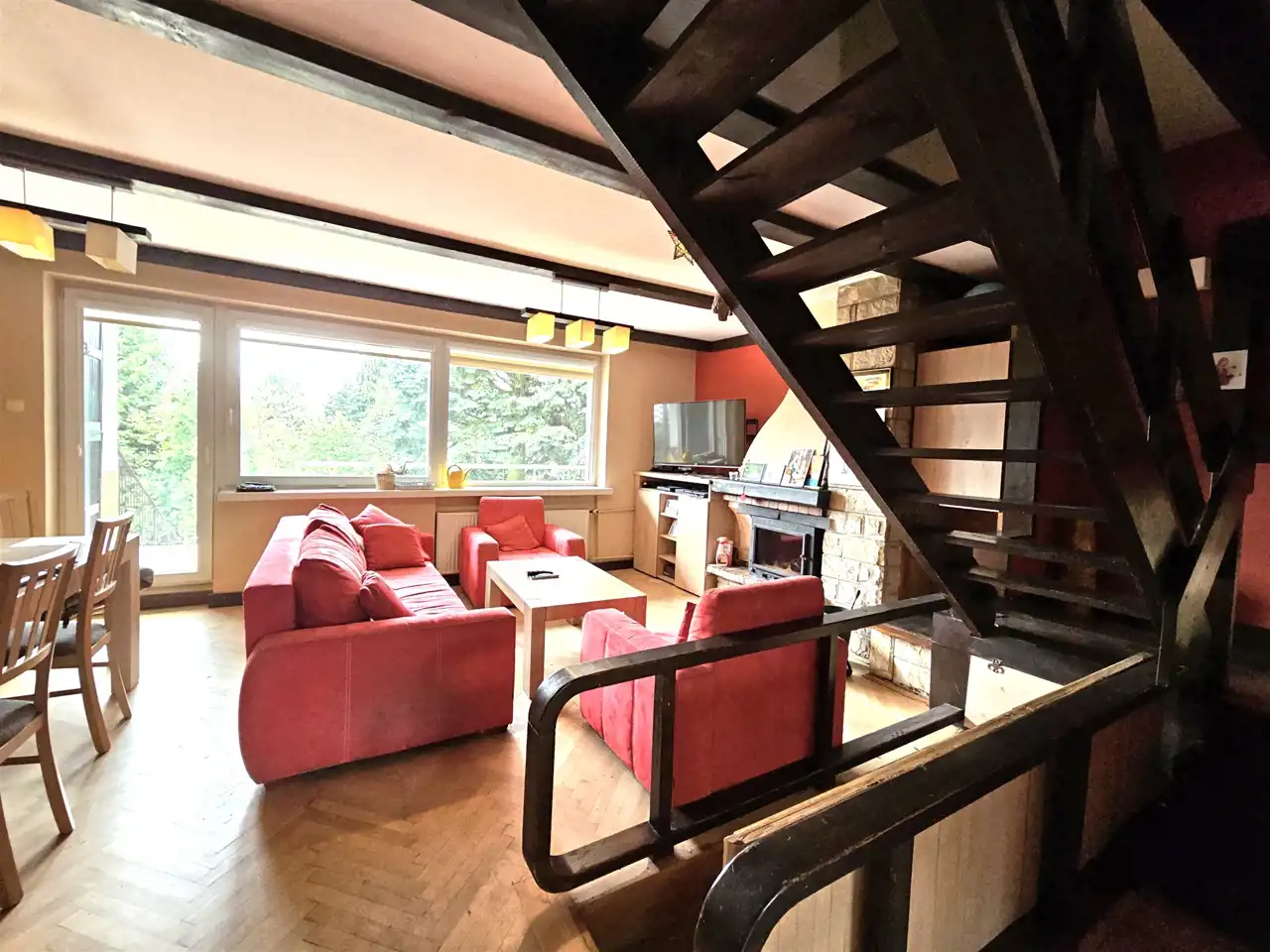 * obszerny salon z wyjściem na taras i do ogrodu,