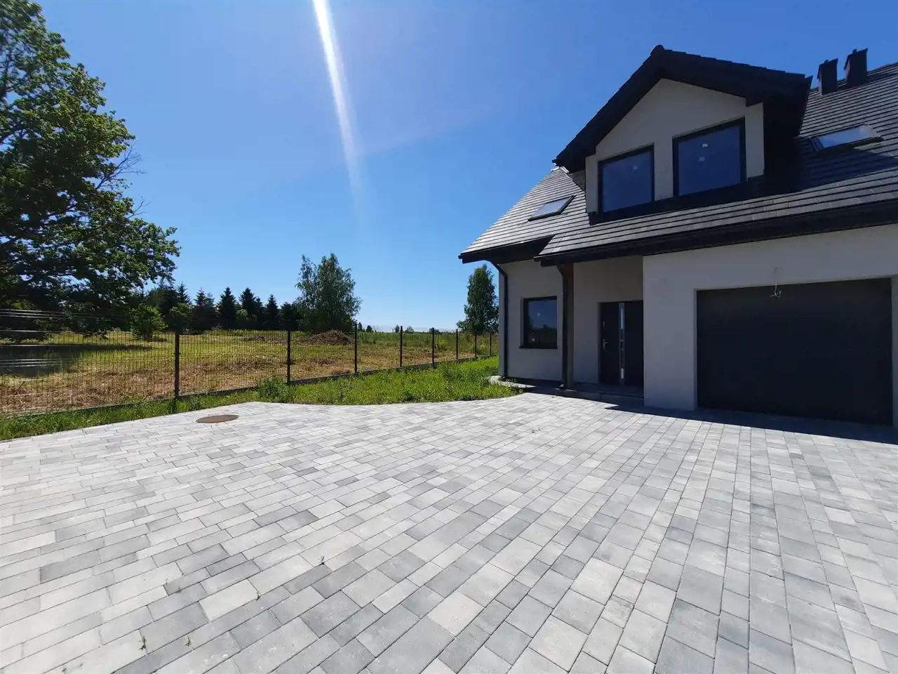 Dom posadowiony na działce o pow. 683 m2. Utwardzenia z kostki brukowej: podjazd do garażu, opaska wokół domu, taras.