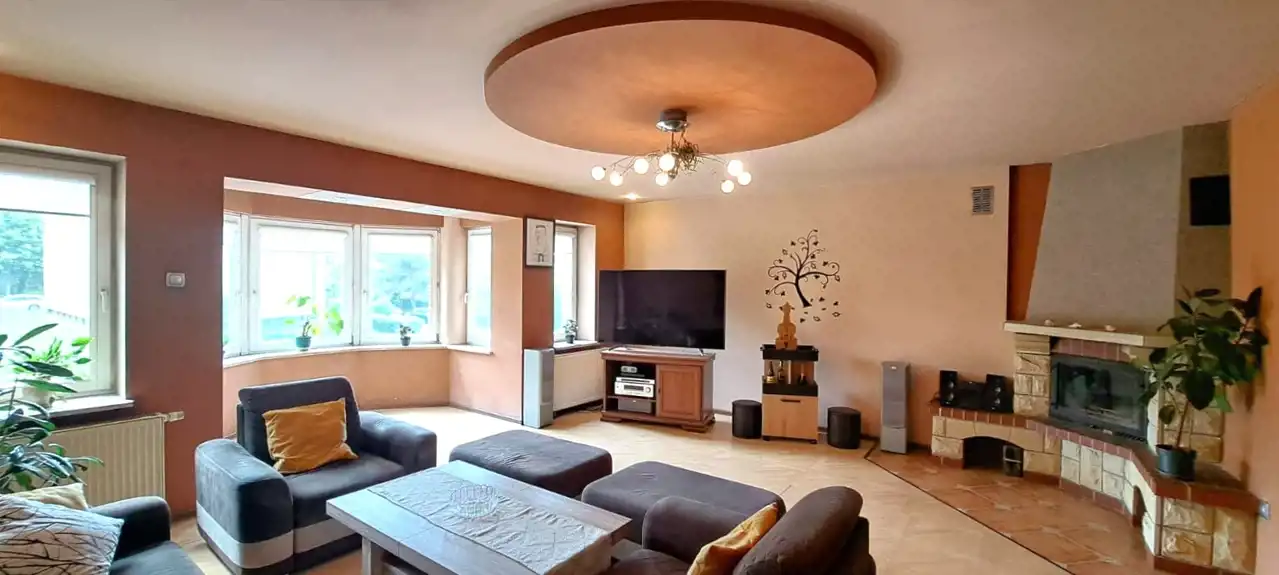 - salon z kominkiem