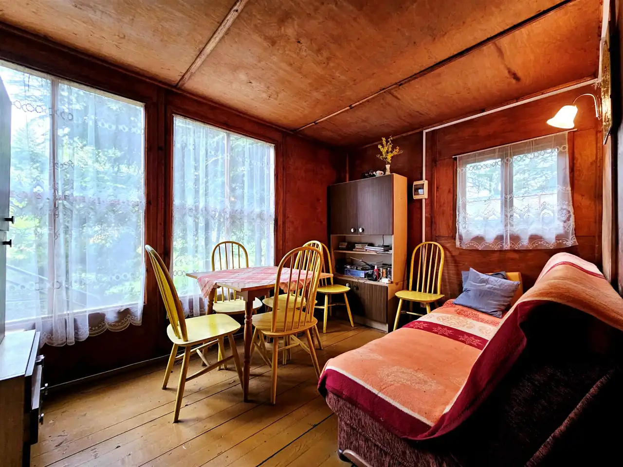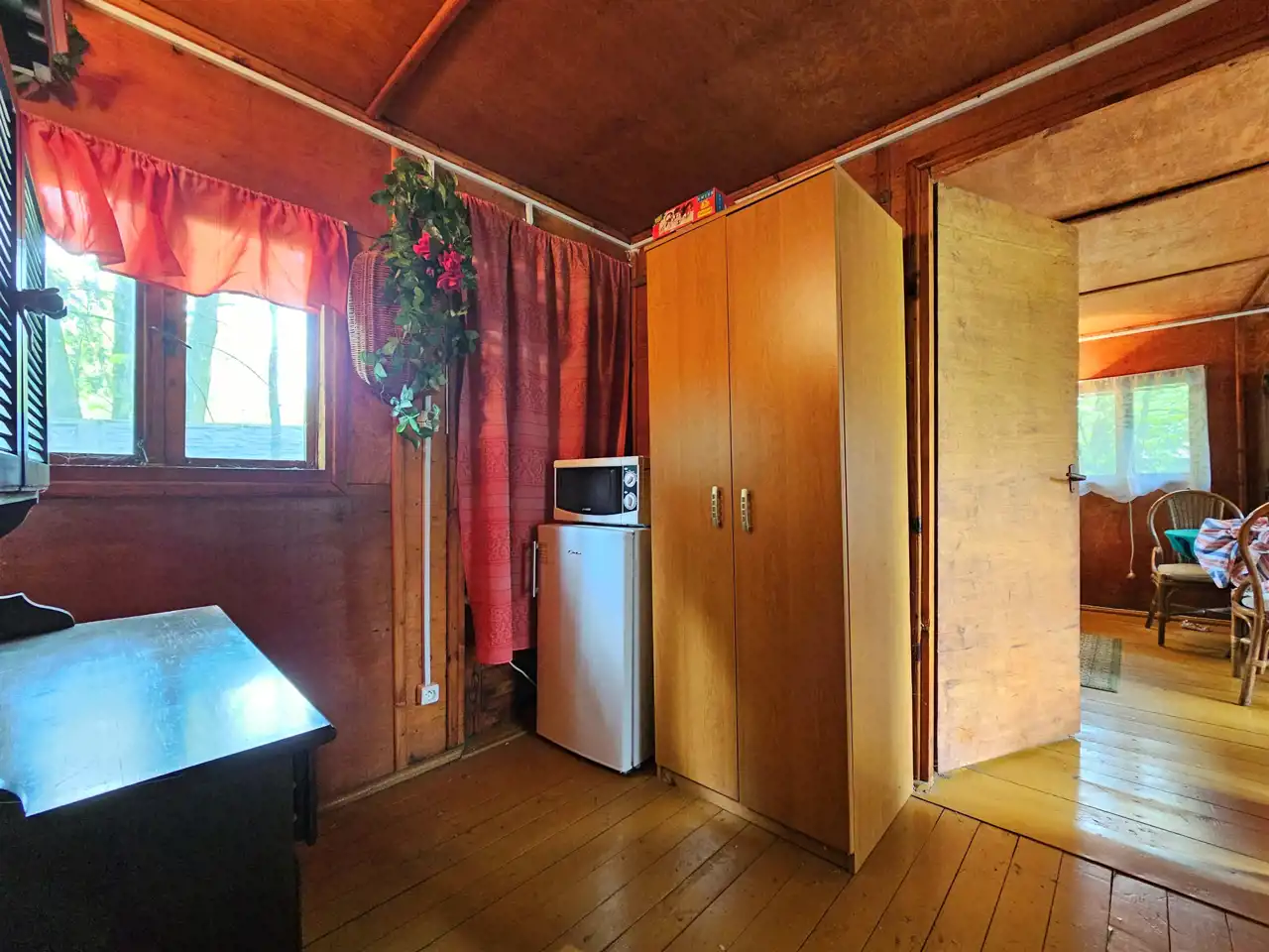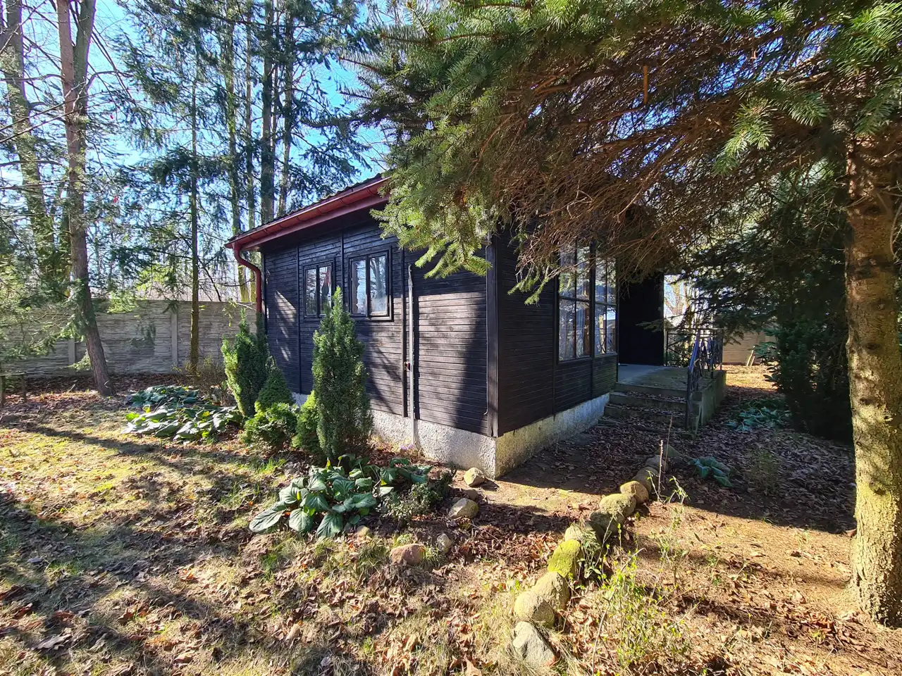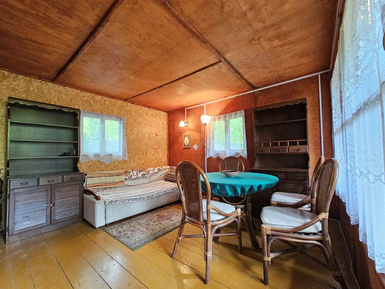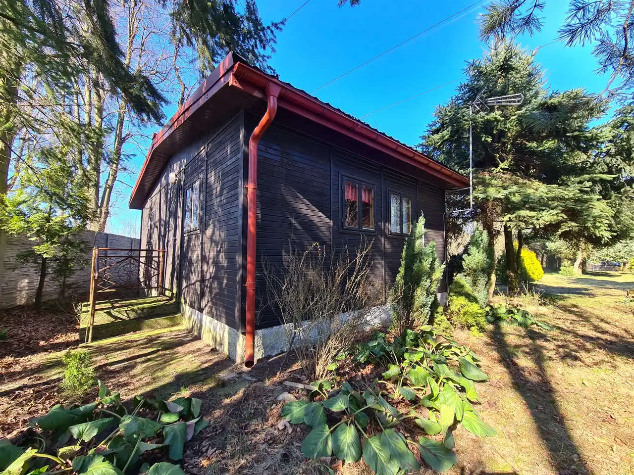 Na działce znajduję się drewniany domek letniskowy oraz blaszany garaż. Nieruchomość ogrodzona wjazd od