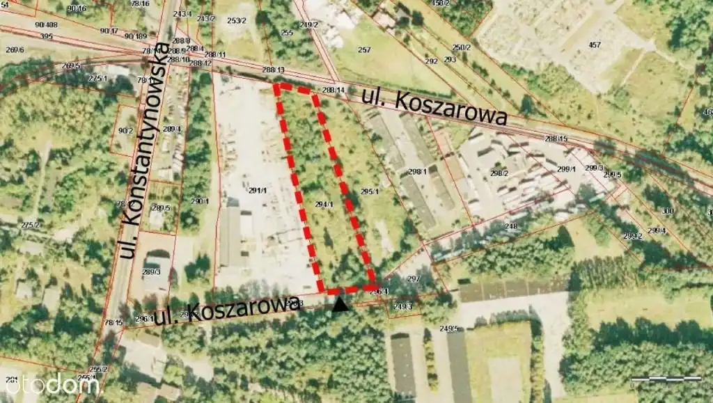 Całkowicie ogrodzona płotem betonowym. Kształt zbliżony do prostokąta o szerokości frontowej 49 m.