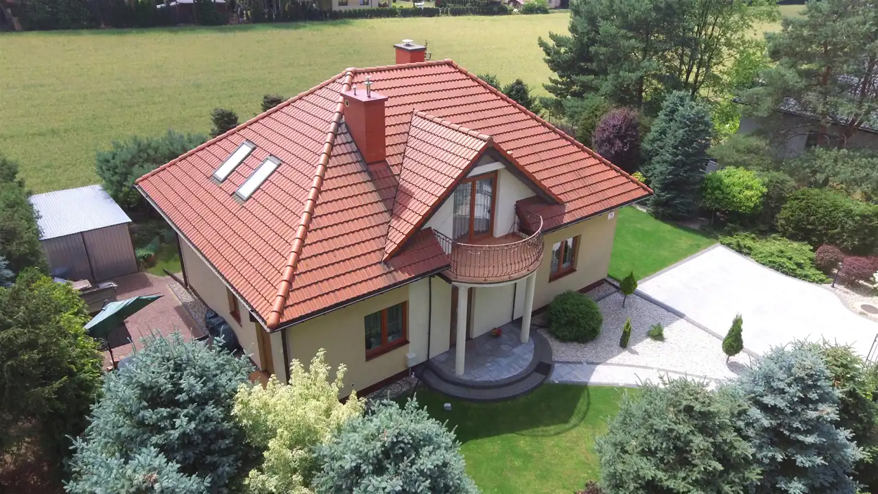 Dach pokryty jest dachówką ceramiczną w kolorze cegły.