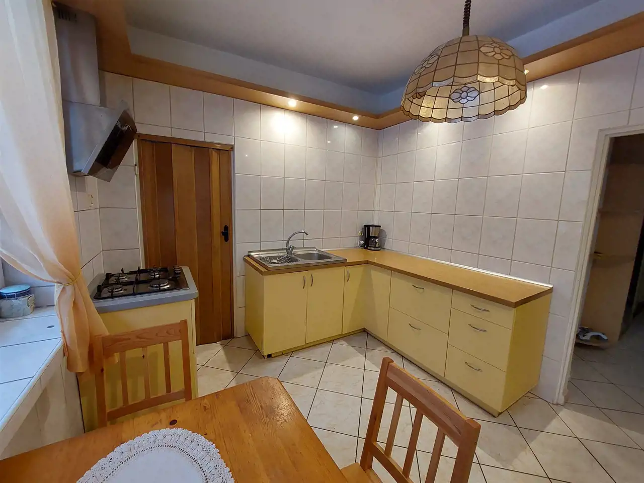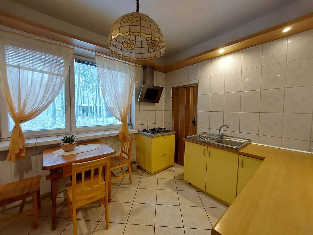 - Kuchnia ze spiżarnią (11,40 m2) : meble kuchenne w zabudowie, zlew dwukomorowy, kuchnia gazowa, okap, lodówka. Podłoga: terakota, ściany: glazura