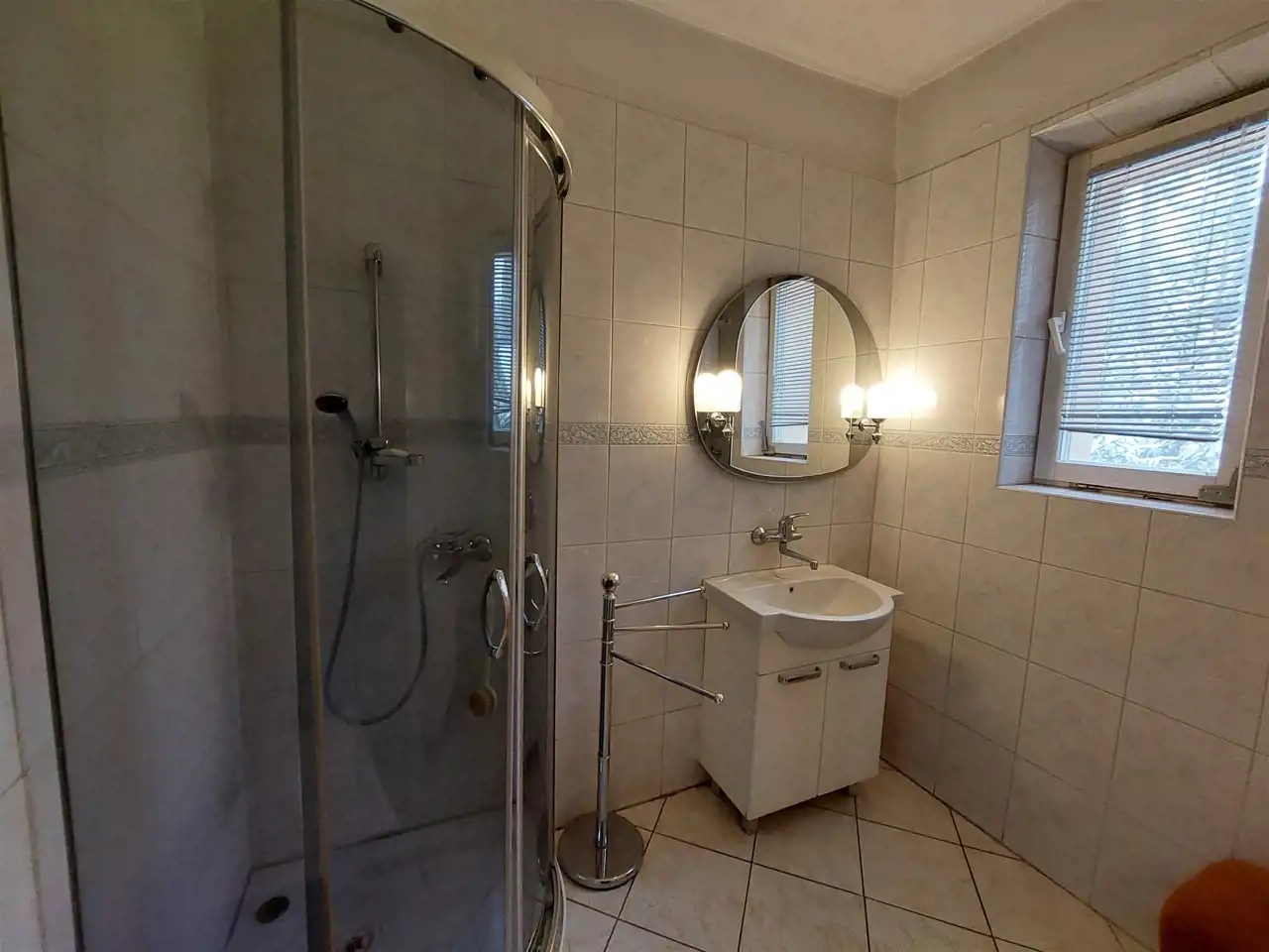 - Łazienka (3,60 m2) - glazura i terakota; umywalka z szafką oraz kabina prysznicowa