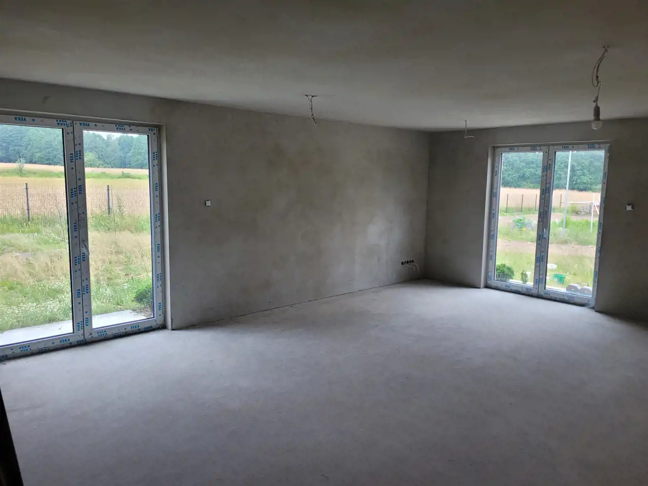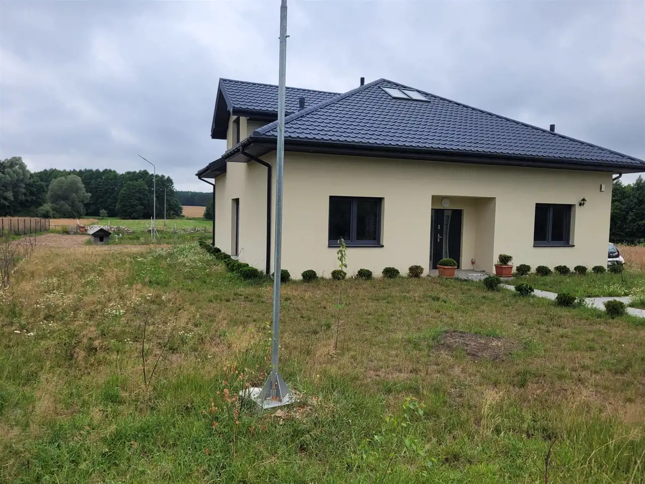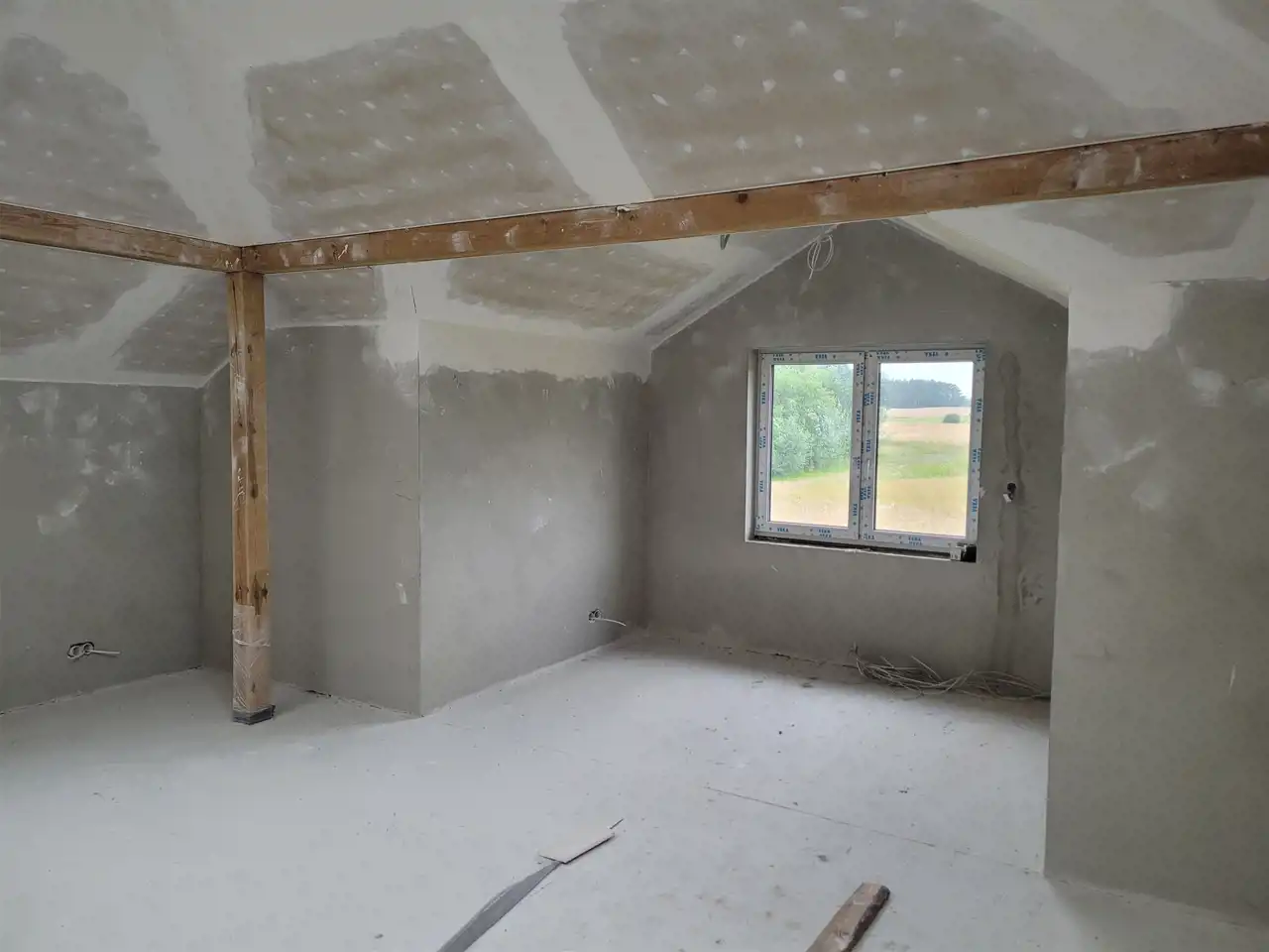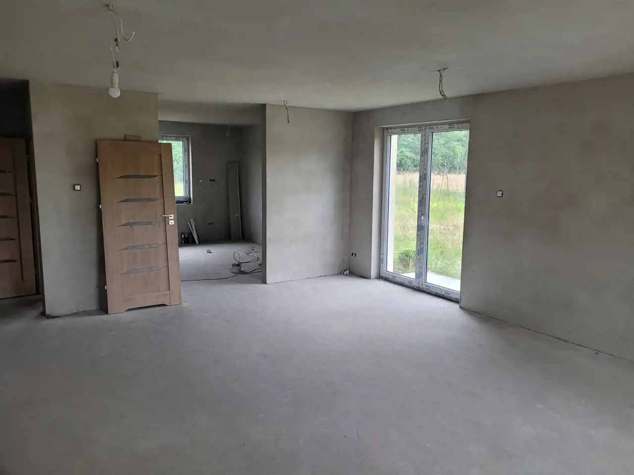 Wybudowany z cegly ocieplony styropianem 20cm. Drzwi węwnetrzne z opaskami. Zrobiona podłogówka na dole i górze, posadzki wylane, tynki zrobione, podłączony prąd z siłą, hydraulika, piec dwufunkcyjny gazowy, zbiornik gazu na posesji o pojemności 2700m3.