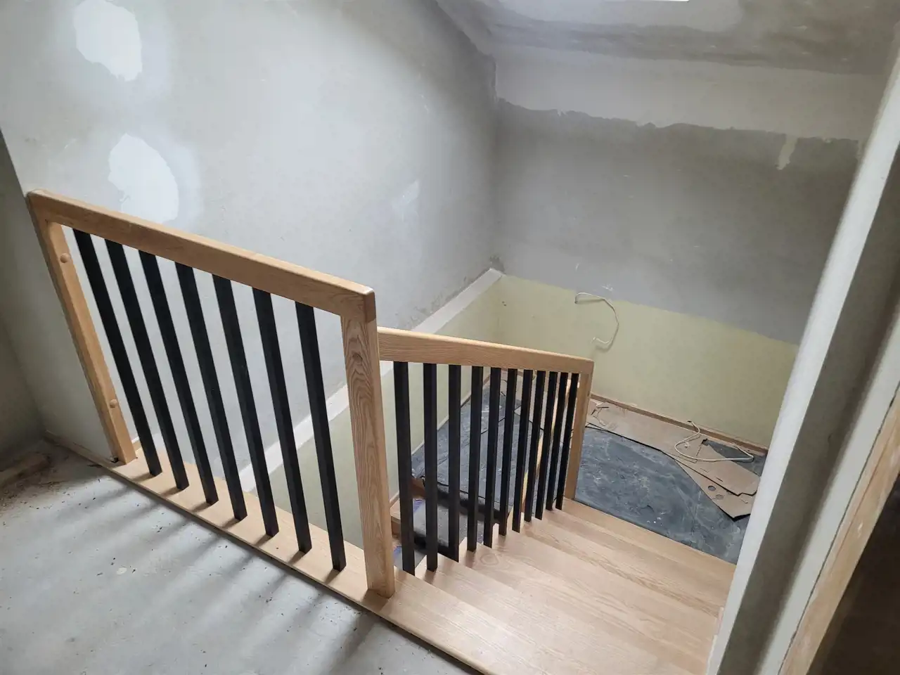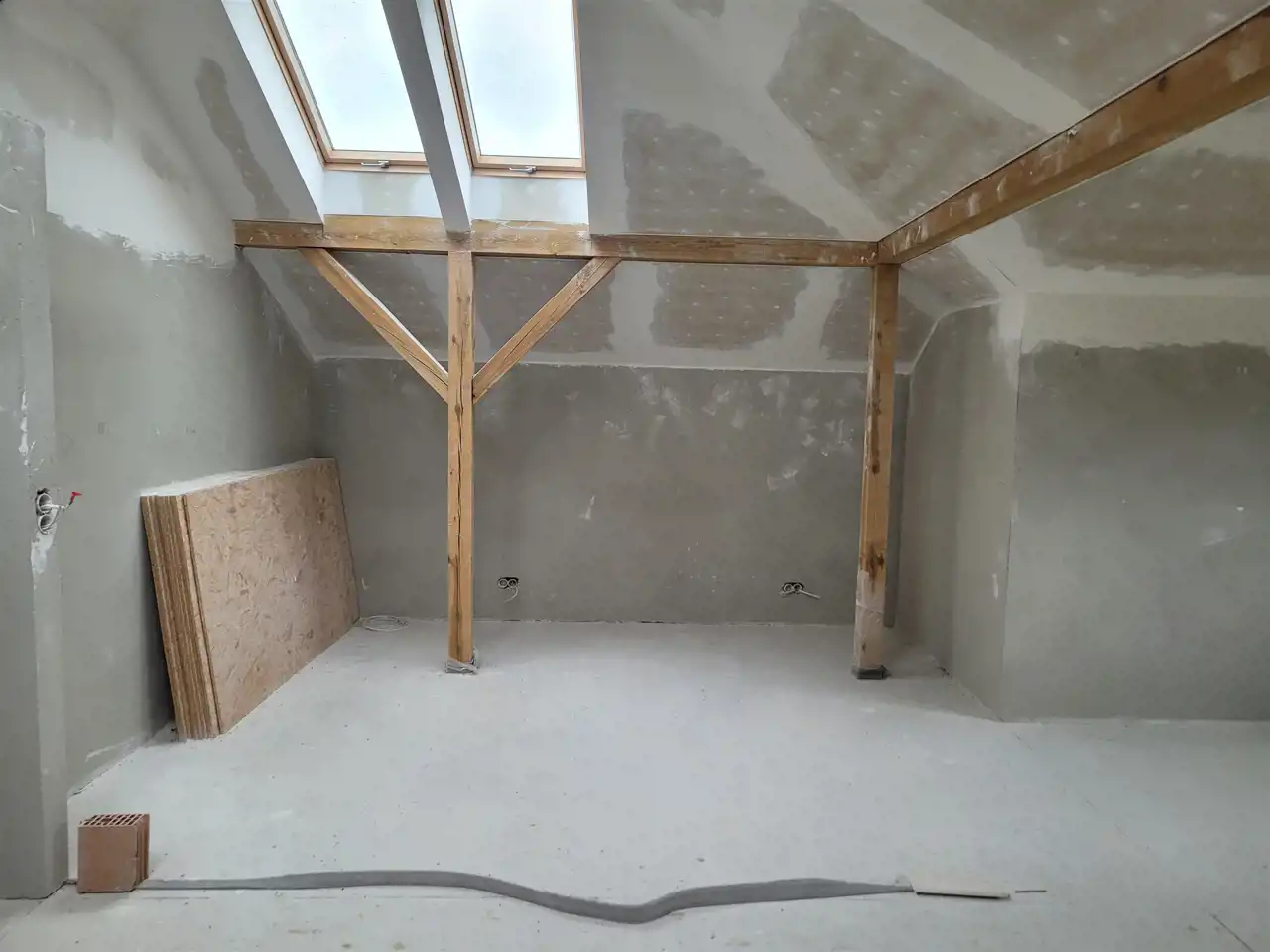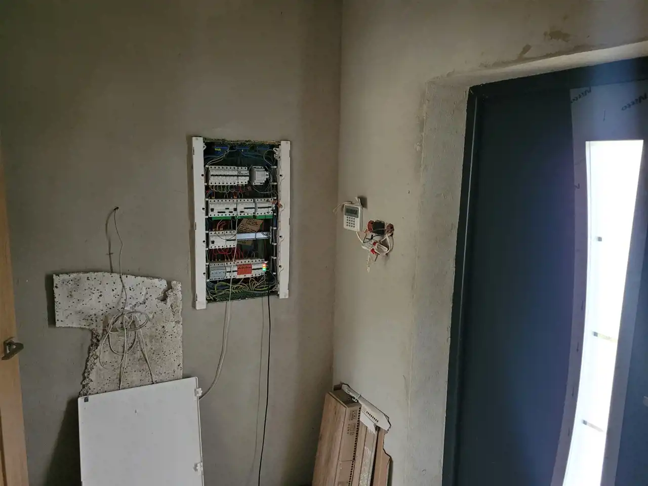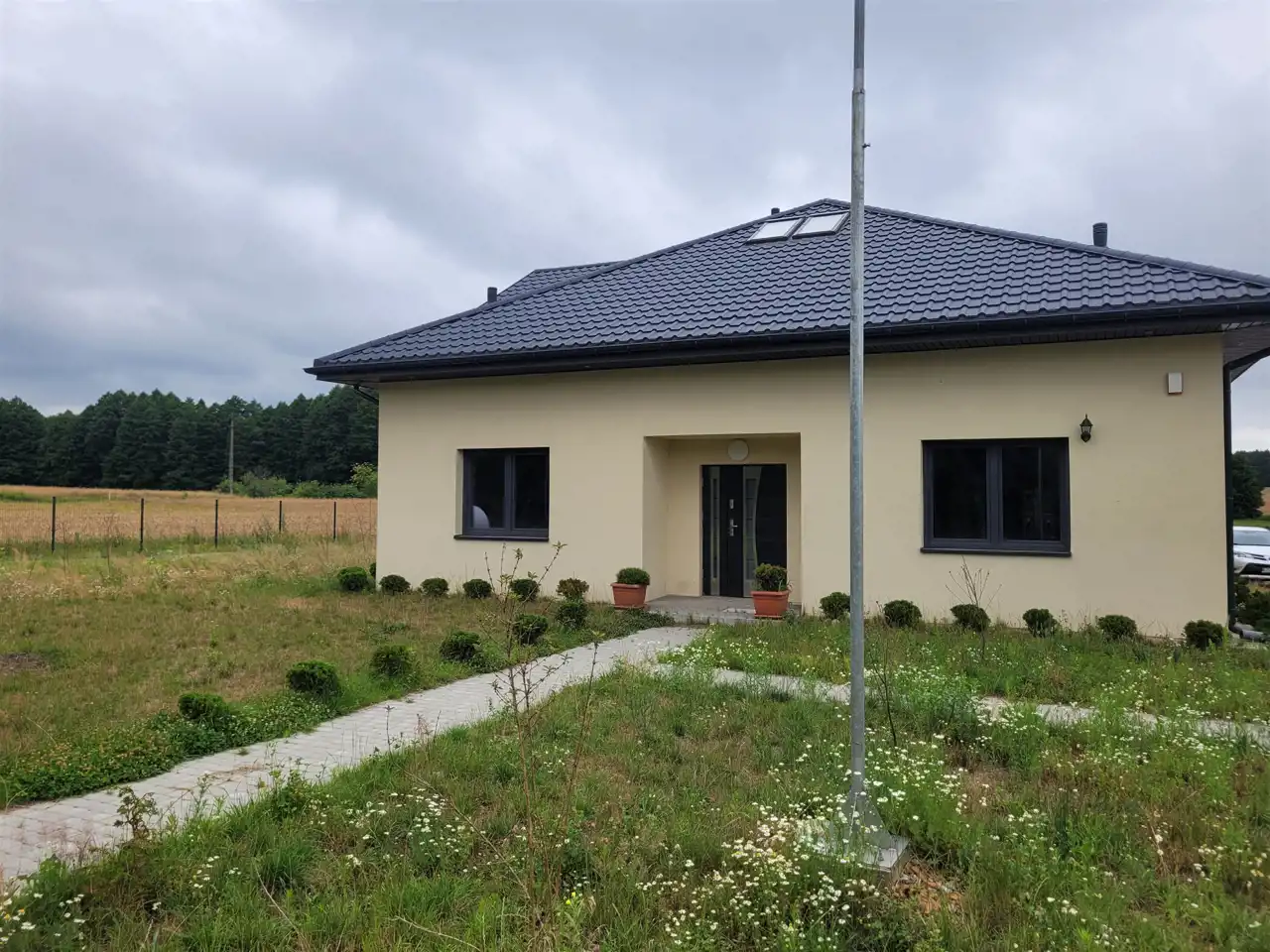 Wybudowany z cegly ocieplony styropianem 20cm. Drzwi węwnetrzne z opaskami. Zrobiona podłogówka na dole i górze, posadzki wylane, tynki zrobione, podłączony prąd z siłą, hydraulika, piec dwufunkcyjny gazowy, zbiornik gazu na posesji o pojemności 2700m3.
