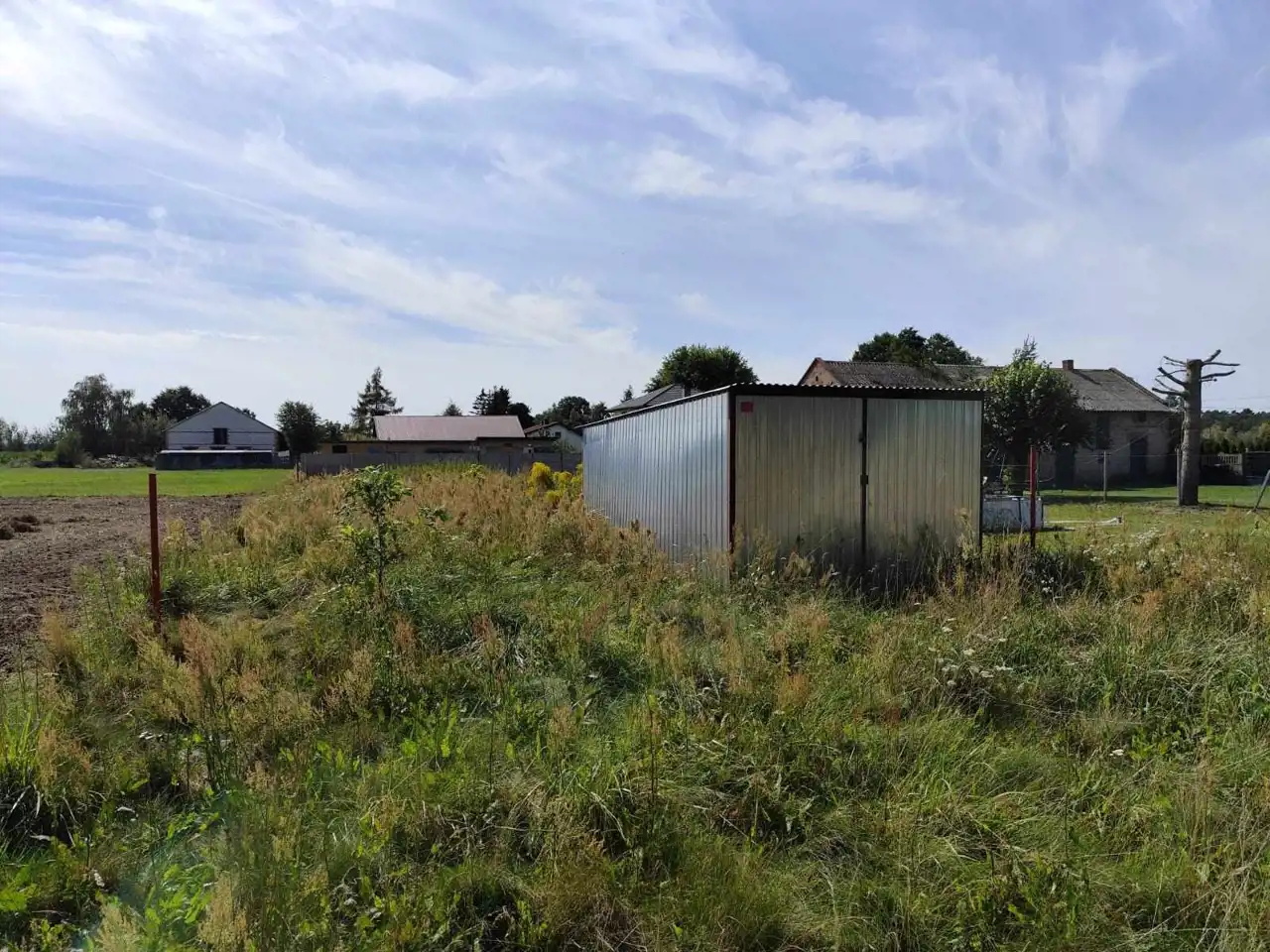 W głębi nieruchomości znajduje się blaszany garaż.